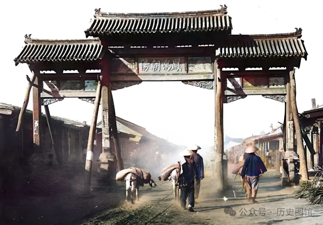 照片中就是北牌楼,高大的三间四柱牌楼横跨在街道上。牌楼匾额上“凤鸣朝阳”四个立体木雕字非常醒目。几名当地人正在从牌楼下经过,画面很有年代感。