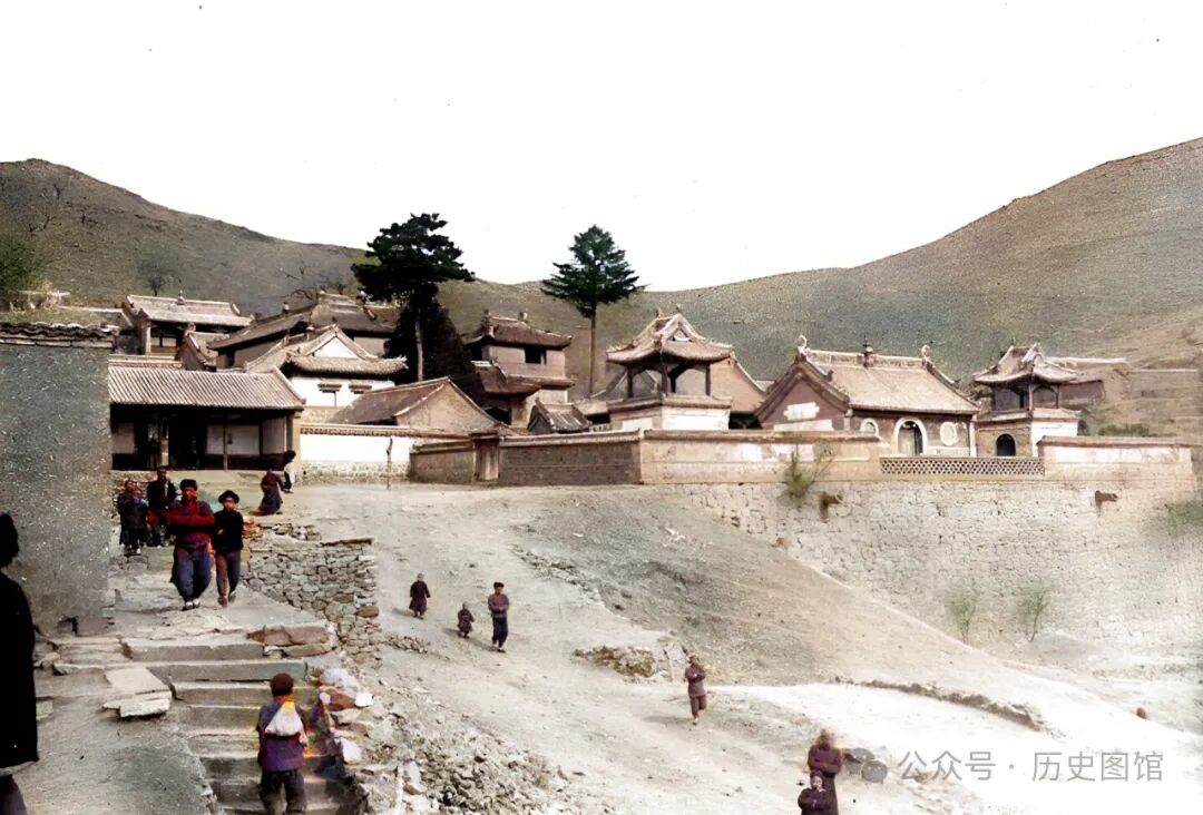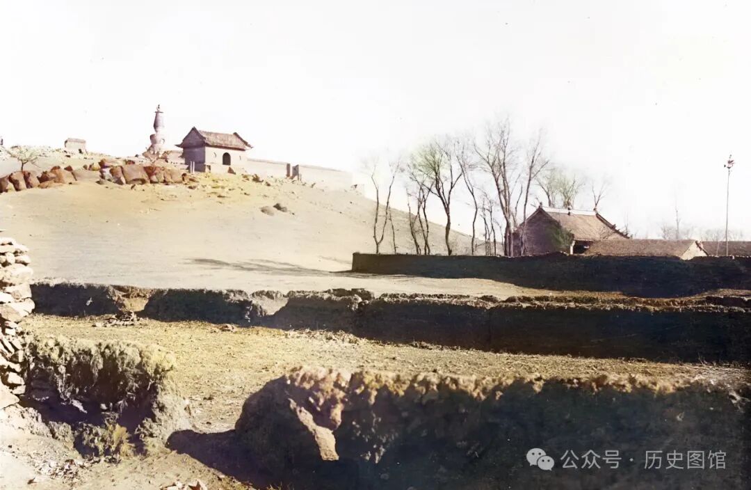 这是30年代,位于黑水镇西边的喇嘛寺庙西院寺。黑水镇,位于建平县西北部。寺庙建在山顶上,山门、围墙和白塔清晰可见。山脚下,也是一座寺庙,院子里竖起高大的旗杆。