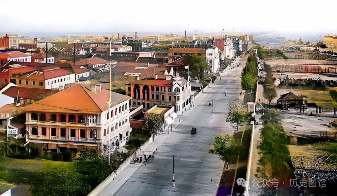 30年代,汉口一条大街上的景象。街道笔直,一眼望不到尽头。这里是整个汉口的缩影。街道两侧,高楼林立,也有一些中式建筑。