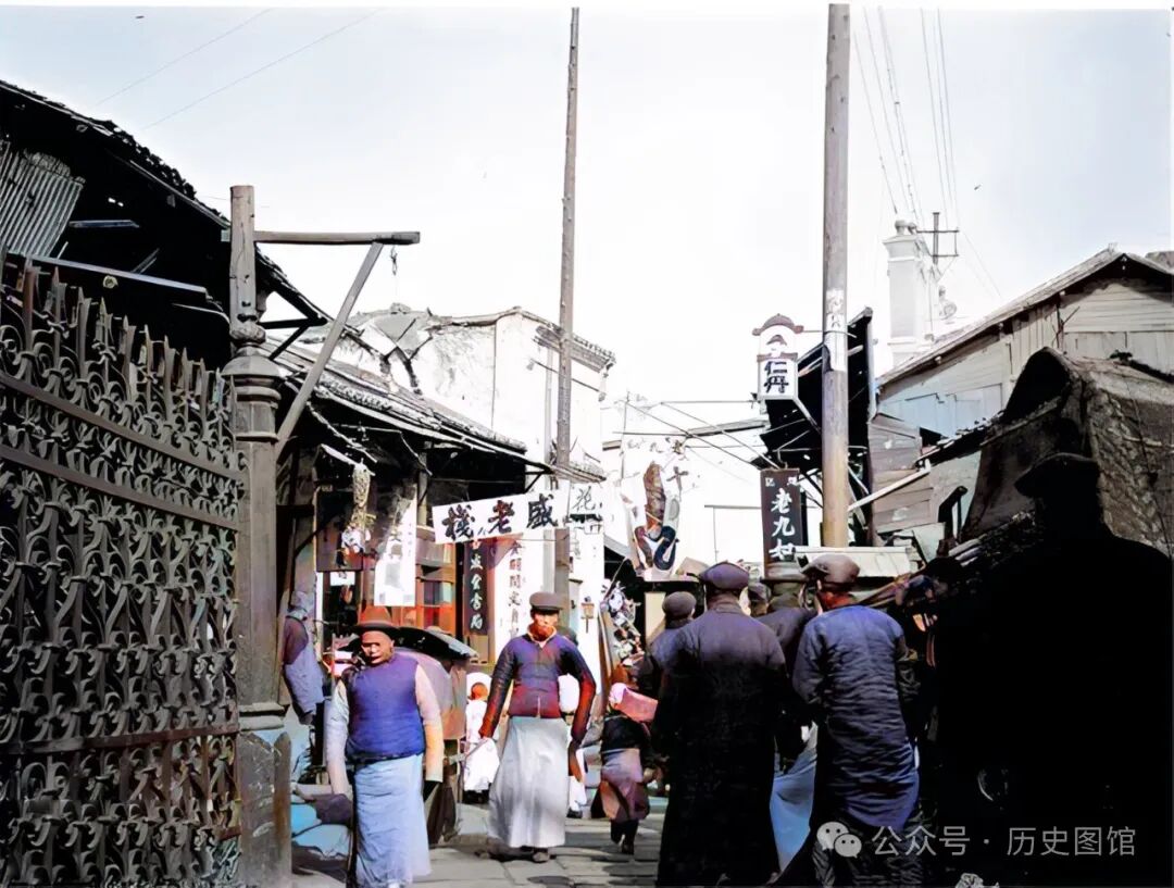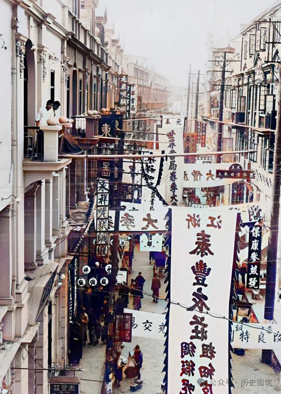 20年代,位于汉口的一条商业街景象。这应该是一条位于老城区的小街道,街道很窄,地上铺着石板。街边的柱子上,挂着很多广告牌子,琳琅满目。