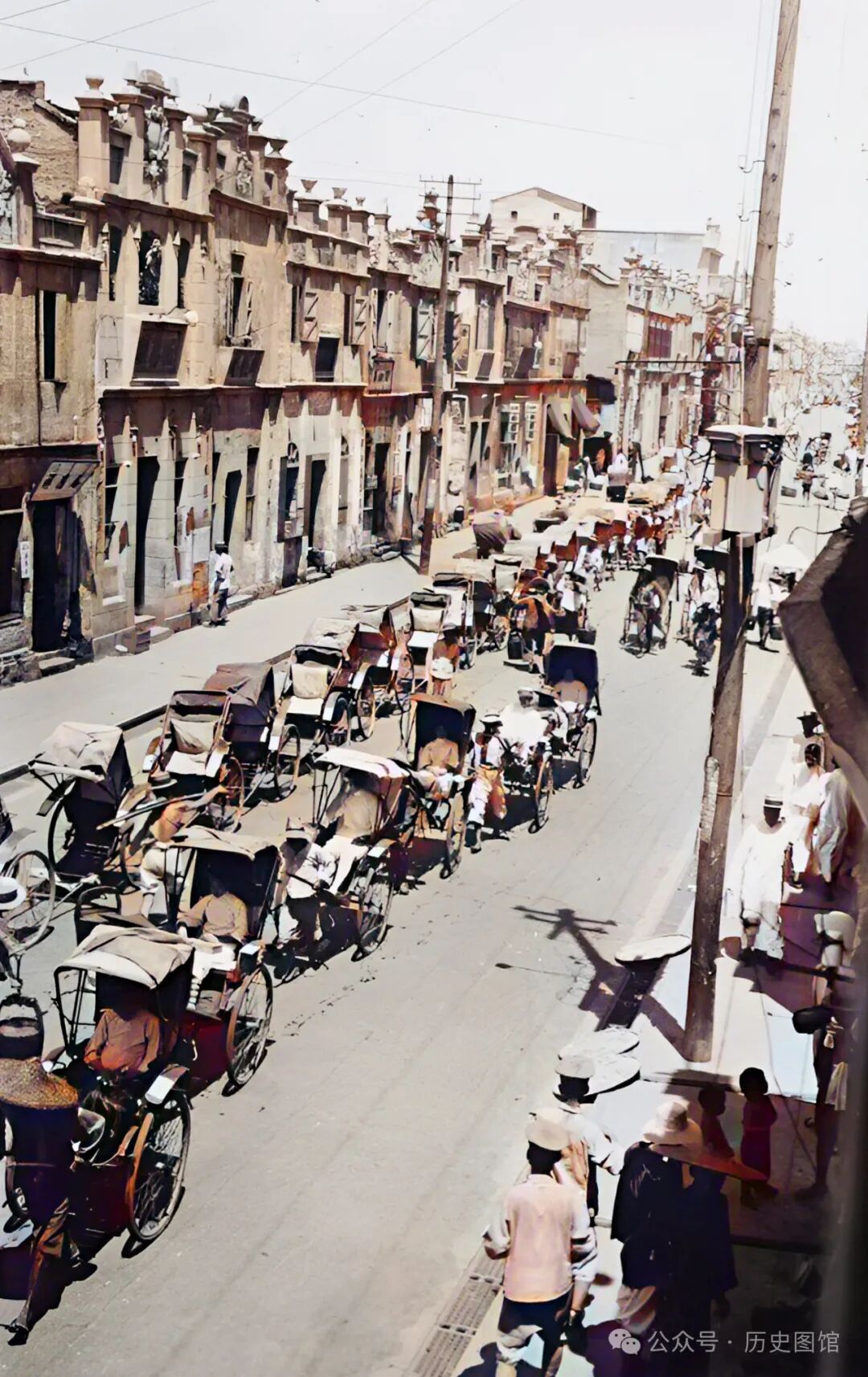 30年代,汉口城内的一条街道上,黄两排包车正在排队等待载客,看上去非常有秩序,应该是位于汽车站或者是火车站附近。街道笔直,一眼望不到尽头,路两侧大楼林立。繁华程度,不亚于现在。