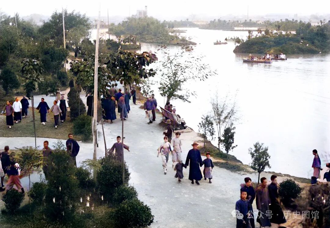 民国时期,汉口中山公园内景象。公园内水清岸绿,小船水面上游弋。人造景观很少,风光古朴自然。每逢节假日,当地人都会三五成群到公园里游玩。