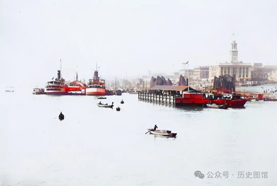 30年代,汉口码头附近景象。江面烟波浩渺,水天一色。远处,江汉关钟楼清晰可见。码头上停泊着几艘巨型轮船,一些接驳的小船划过江面。自汉口开埠后,一批轮运码头逐渐落成。当时,汉口码头的吞吐量名列全国第二。