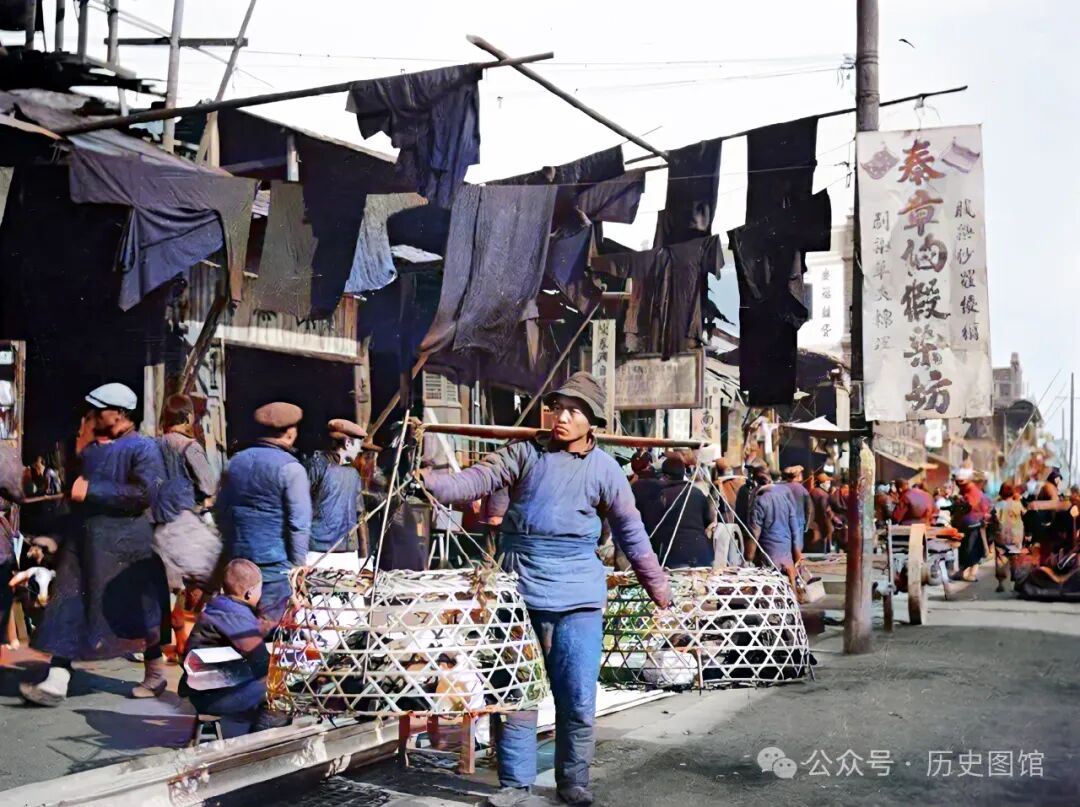 1915年,汉口华景街情景。虽然只是街道一角,但也能看出热闹和繁华程度。街边店铺是一家染坊,门口竹竿上悬挂着染好的衣服和广告招牌。一名挑着鸡笼的男子从街头走过。