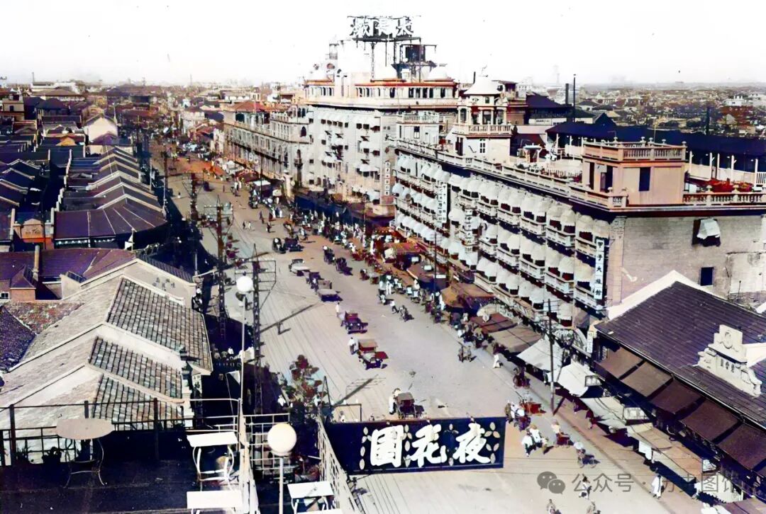 街道上车水马龙,已经展现出了现代化城市的风貌。近处,“夜花园”的照片十分醒目,应该当时的一处娱乐场所。