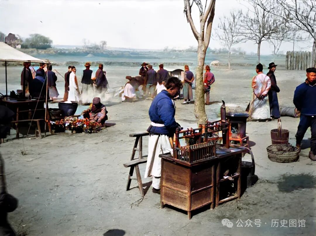 1915年,京汉火车站外面的露天市场。路边有一些小吃摊,售卖不同的美食,乘客可以在这里就餐,选择仔细喜欢的食物。不远处,还停着一顶轿子。几名乘客正在和轿夫砍价,这场面与如今的出租车何其相似。