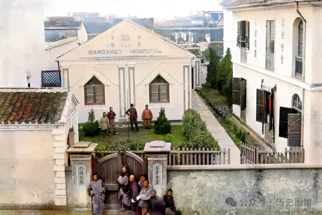 1931年,位于汉口解放大道上的协和医院。当时,仁济医院搬到解放大道后,改称“协和医院”。几名当地人聚集在医院门口,等待开门。院内,一名外国人和三名工作人员站在花园里。所有人都发现了站在对面楼上拍照的摄影师,一齐朝摄影师所在的位置望过来。