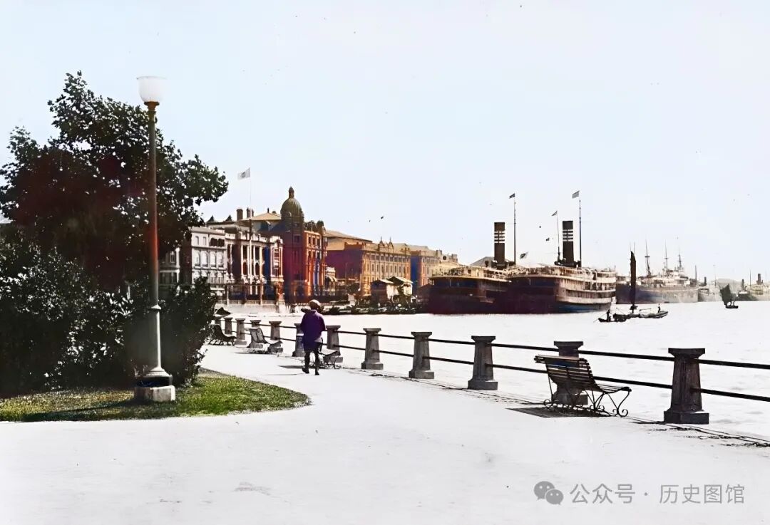 1926年,汉口租界景象。江边码头上停泊着巨型轮船,江岸上大路旁,分布着很多欧式建筑,并建有围墙。汉口租界长4公里,英法德日俄等国都有自己的码头。