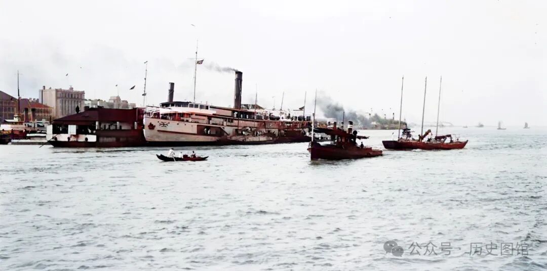 这是也是位于汉口江边的一座码头上的景象。几艘巨大的邮轮停靠在岸边,江岸上的大楼,大部分都是欧式建筑,呈现出一种异域风。