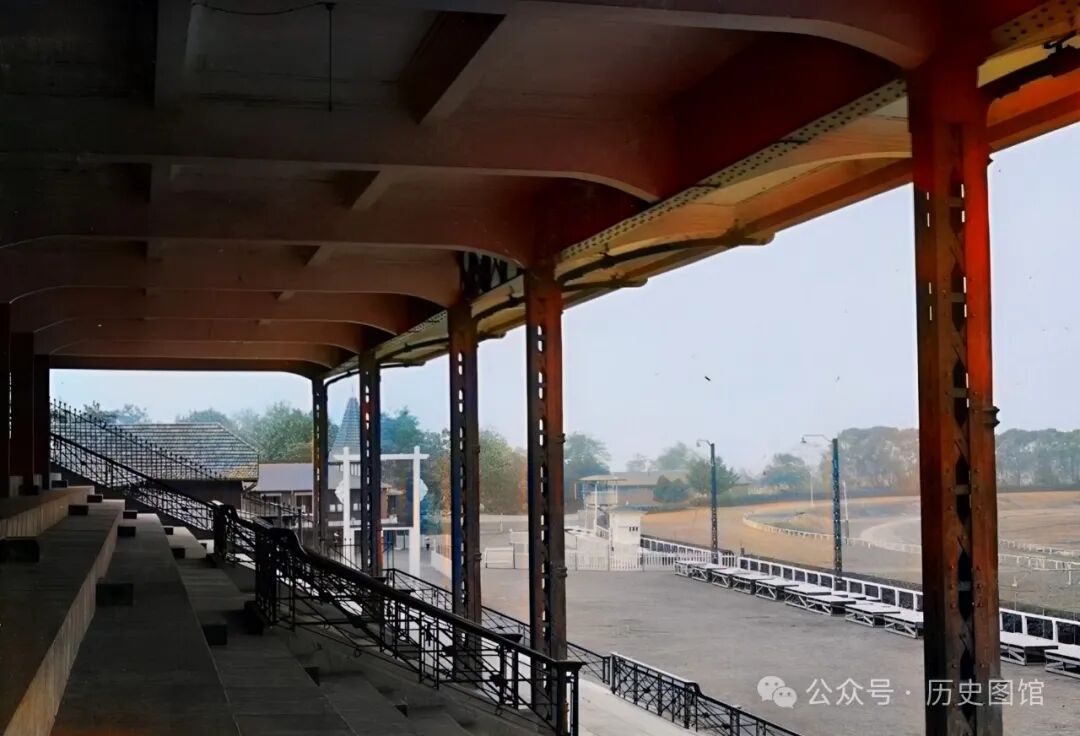 这是位于汉口的一座跑马场。自此清朝开埠以来,很多外国人来到汉口经商、游学、考察。他们也将赛马等体育活动带到了汉口,相继建造了一些跑马场。这是一座规模宏大的赛马场,中间的跑马赛道宽阔,赛场边的看台上建有遮阳棚。