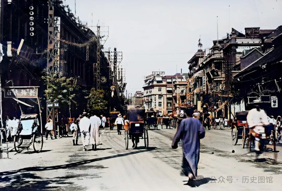 1922年,汉口中山路上的景象。街道宽阔,路两旁建筑中西合璧,不时有黄包车从街上驶过。当时的中山路,是万商云集、商品争流之地。街上有太平洋饭店、真真照相馆、交通旅馆、钟表行、悦新昌绸缎局等店铺。相当得热闹繁华。