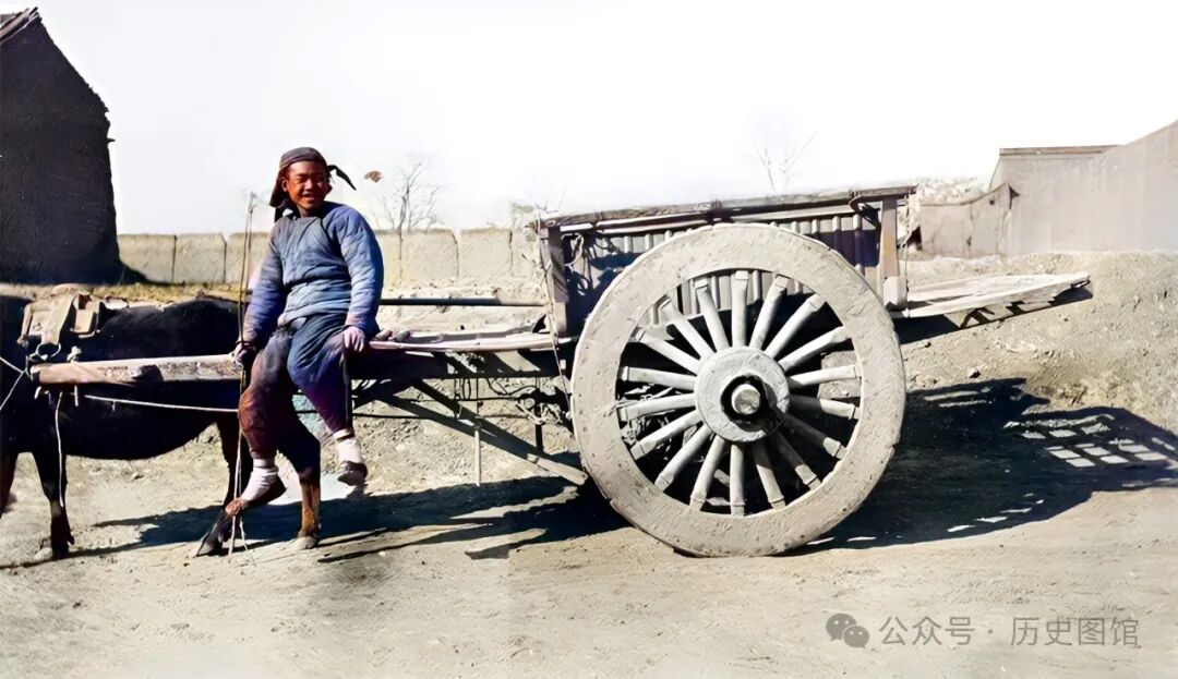 在前往甘肃兰州途中,莫理循看到路上有很多这样的马车,有巨大的车轮,载重量也很大。