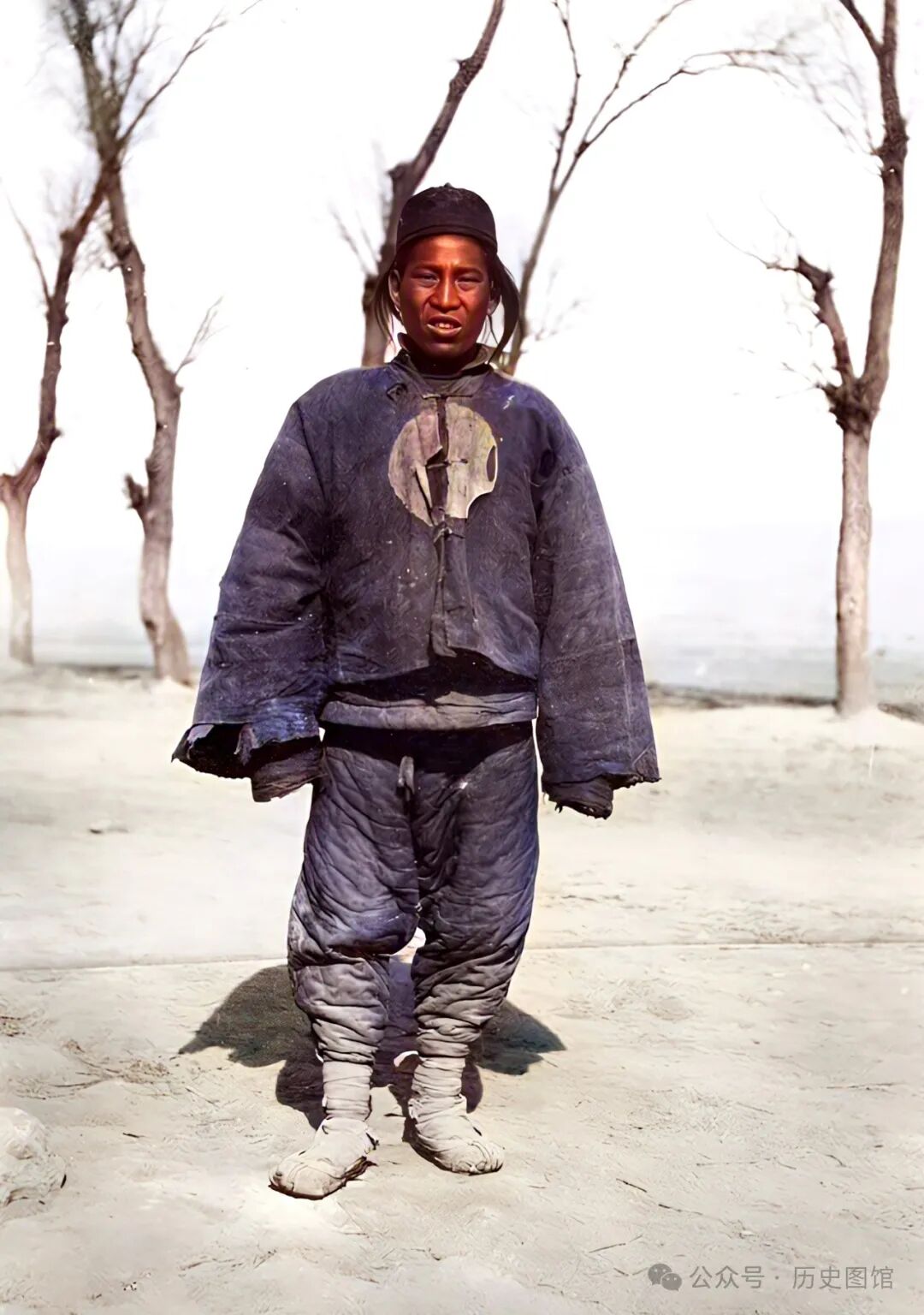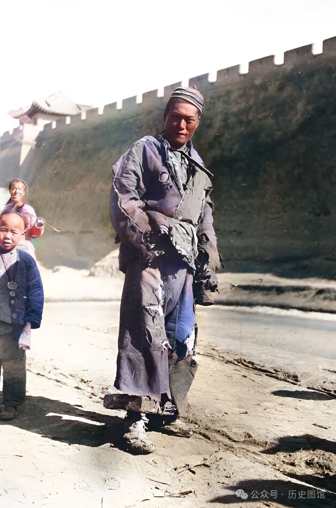 该男子衣衫褴褛,脚上套着一个木枷。走路很困难,他只能站在路边。原来,这是一名被罚在街头示众的犯人。