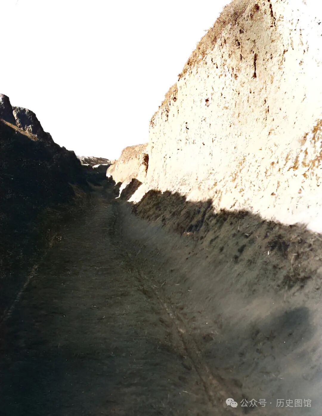 在乾州城外,莫理循的考察队,穿越一条狭窄的路堑。阳光照在一侧的土崖上,很有意境。