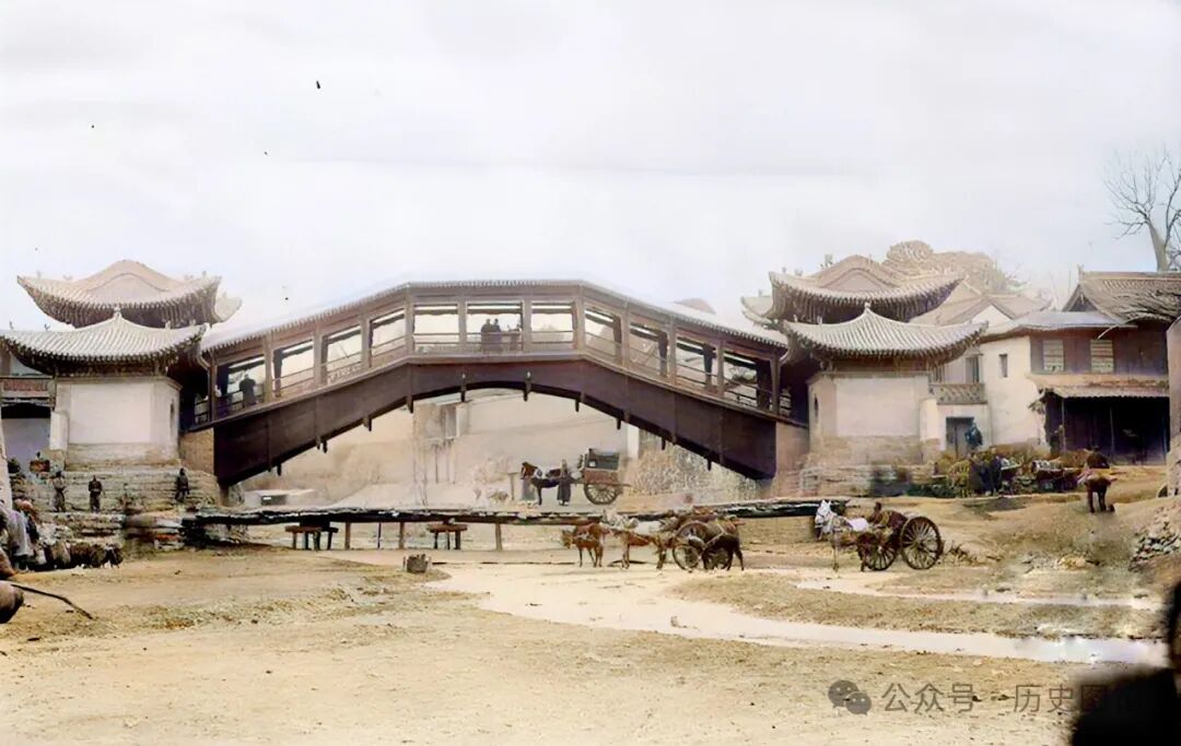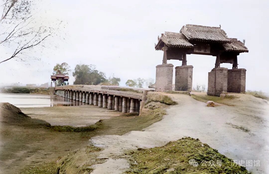 莫理循一行人行至西安府西40里处。在咸阳附近的渭河上,发现了一座古朴的石桥。桥头两端,各建有一座三间四柱牌坊,看上去规格很高。有人说是灞桥,其实不是。