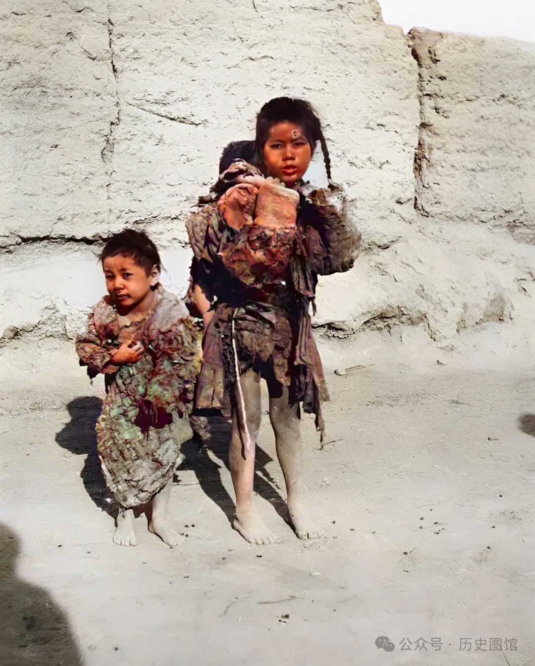 在甘肃考察途中,莫理循在一个村口矮墙下,看到了几名儿童乞丐。他们衣衫褴褛,脚上没有穿鞋子,看上去非常可怜。