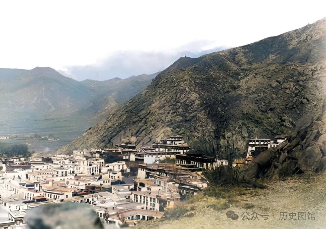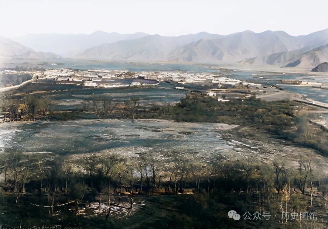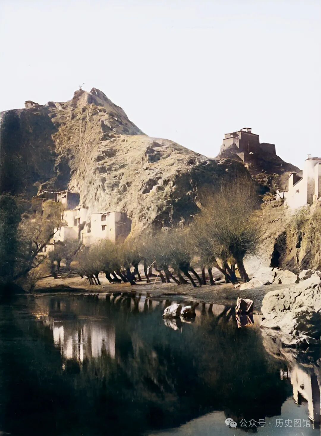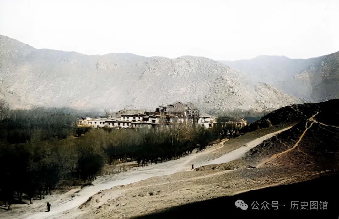 这张照片拍摄于拉萨郊外。在一处山坡上,分布着一些村落。房屋依山势修建,高低错落,掩映在绿树丛中。远处,青山连绵不绝。你很难想象,这里的风光如此秀美。照片拍摄于1927年。
