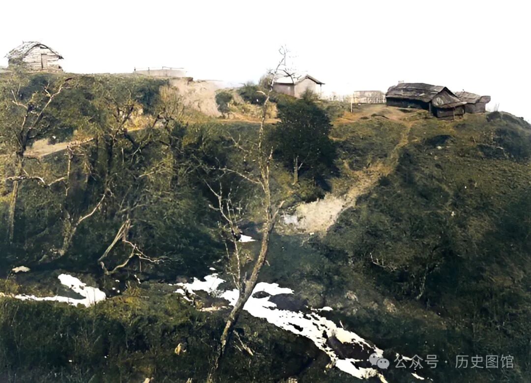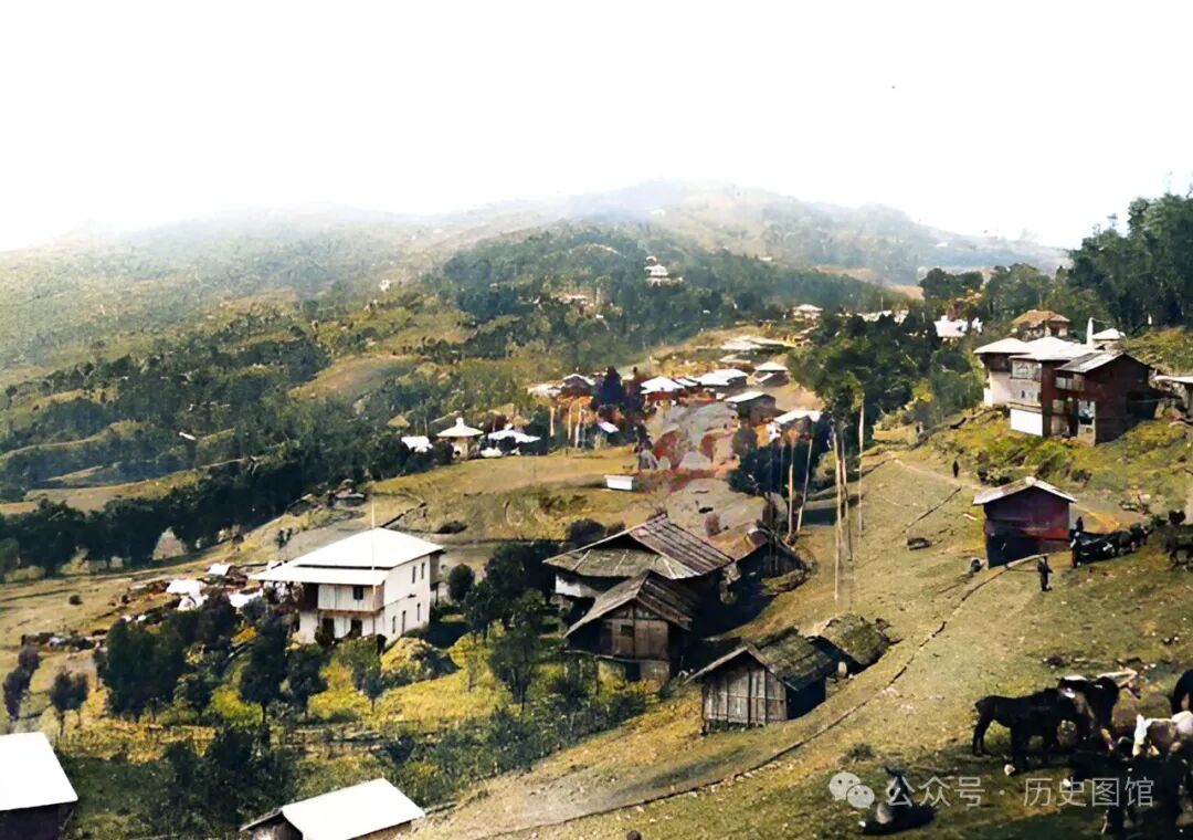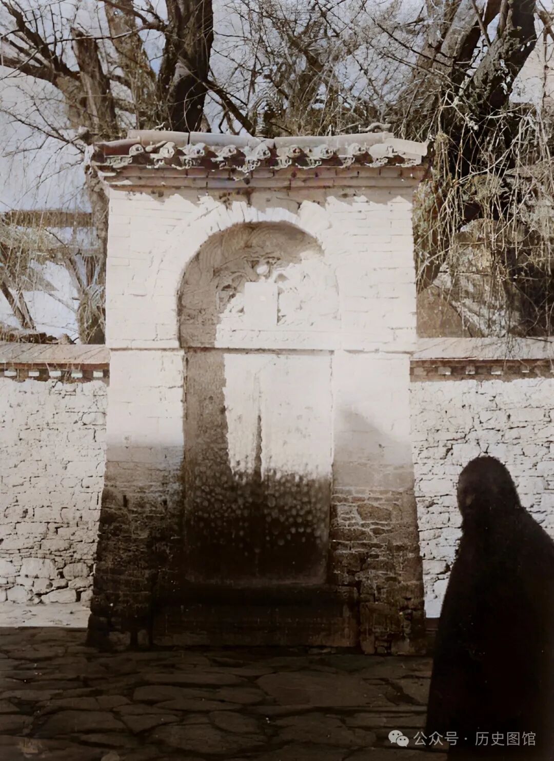 这张照片拍摄于拉萨郊外。在一处山坡上,分布着一些村落。房屋依山势修建,高低错落,掩映在绿树丛中。远处,青山连绵不绝。你很难想象,这里的风光如此秀美。照片拍摄于1927年。