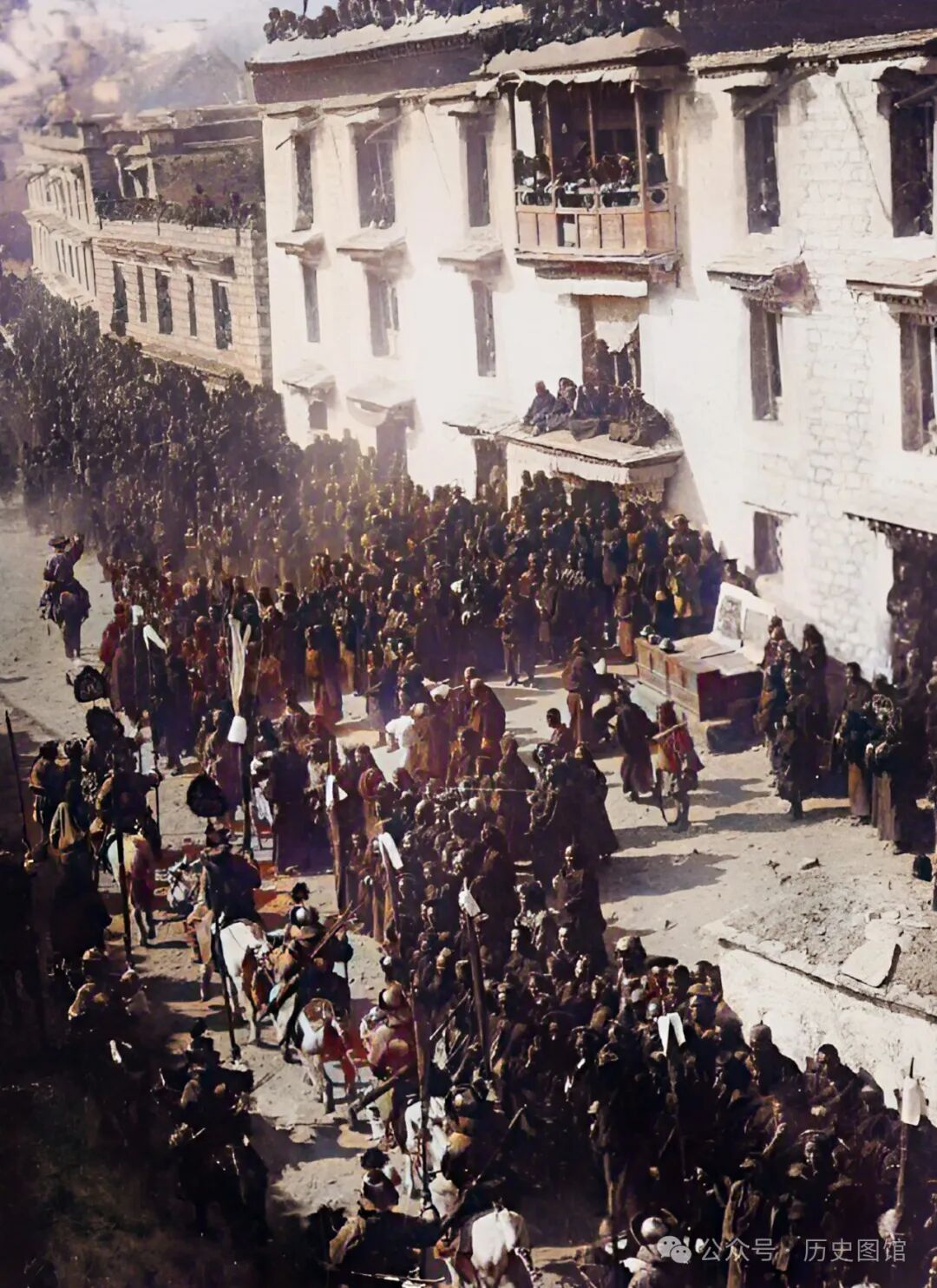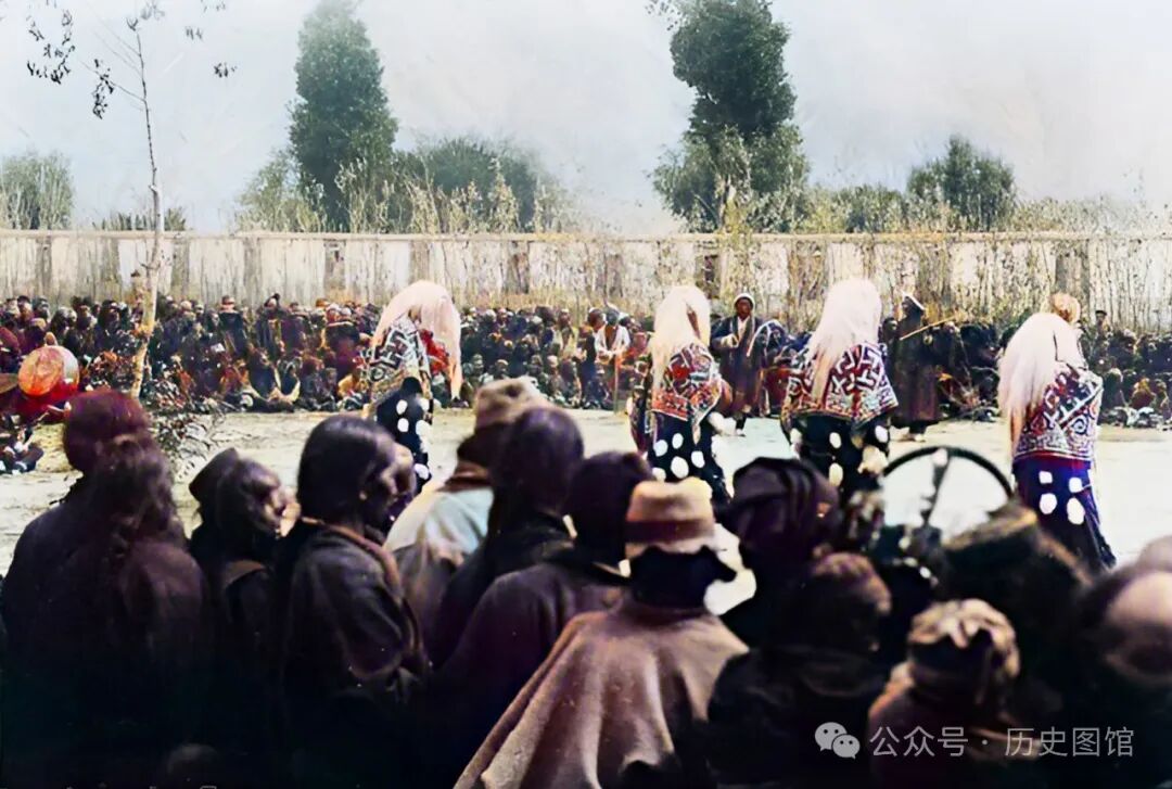 1927年,拉萨一处广场上,当地人正在表演节目。几名舞者身穿奇异的服装,头上戴着白色假发。广场四周围满了观众。几名舞者踩着鼓点,翩翩起舞。引得周围喝彩声不断。神秘的藏文化,让人着迷。