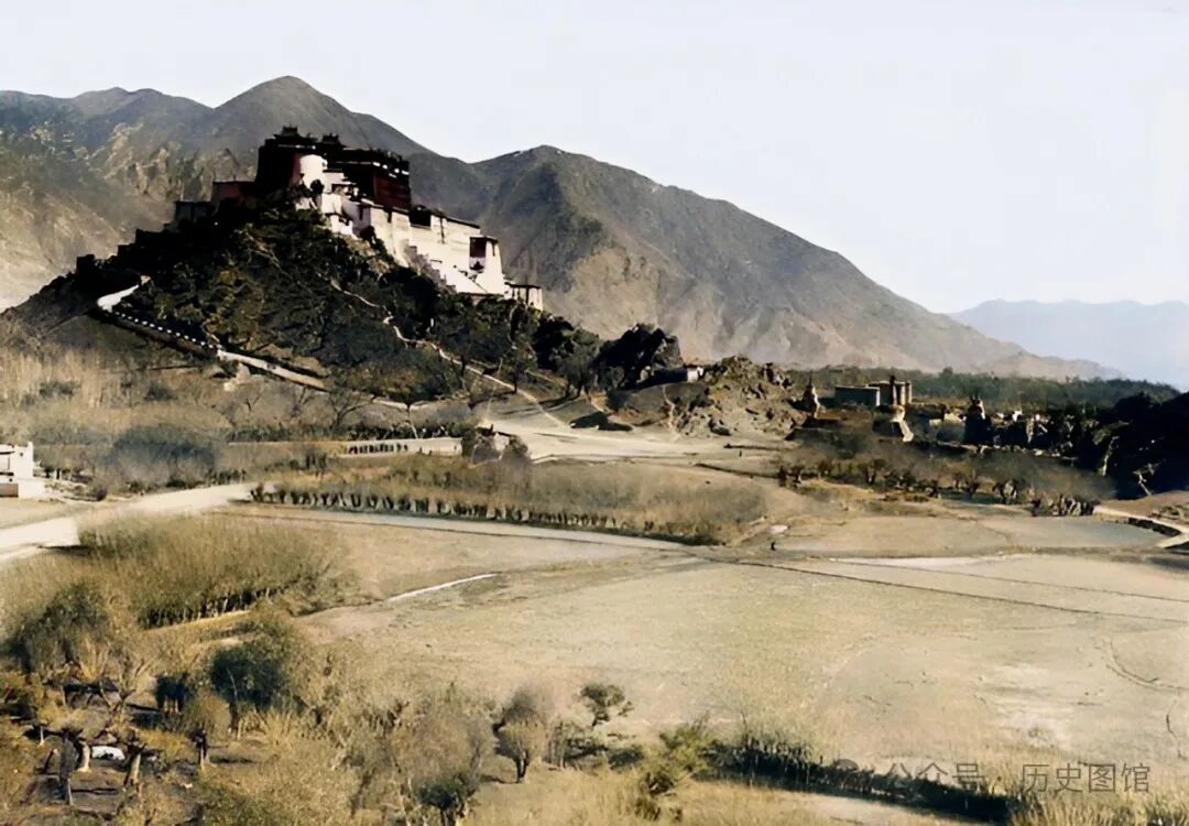 坐落在拉萨市西北玛布日山上的布达拉宫,是世界上海拔最高的宫殿。照片中,布达拉宫前面,还是大片的荒地,生长有杨柳,其间分布着一些民宅,和现在的面貌完全不一样。