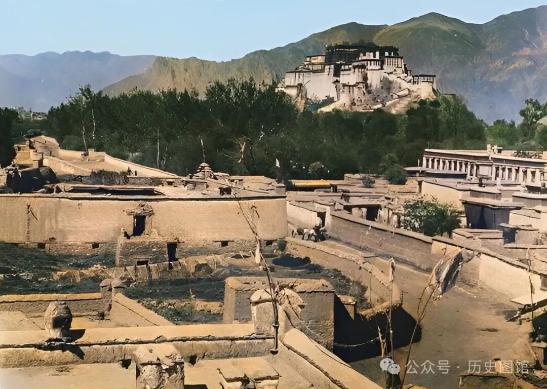 20年代,远眺布达拉宫。布达拉宫,位于西藏拉萨市中心的红山上,总建筑面积13万多平方米。是西藏现存规模最大、风格最全、保存最完整的包公式建筑群。照片中,近景处是一个村落,以及民房等建筑。