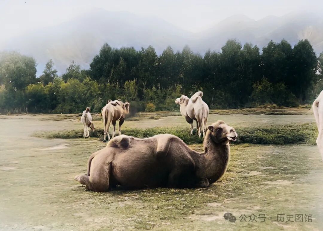 1927年,几只骆驼在客栈外面吃草。这些都是往来西藏高原上进行贸易的商旅队的骆驼。在过去,西藏地区交通不便,负重大、耐力好的骆驼,就成为了主要的交通和运输工具。