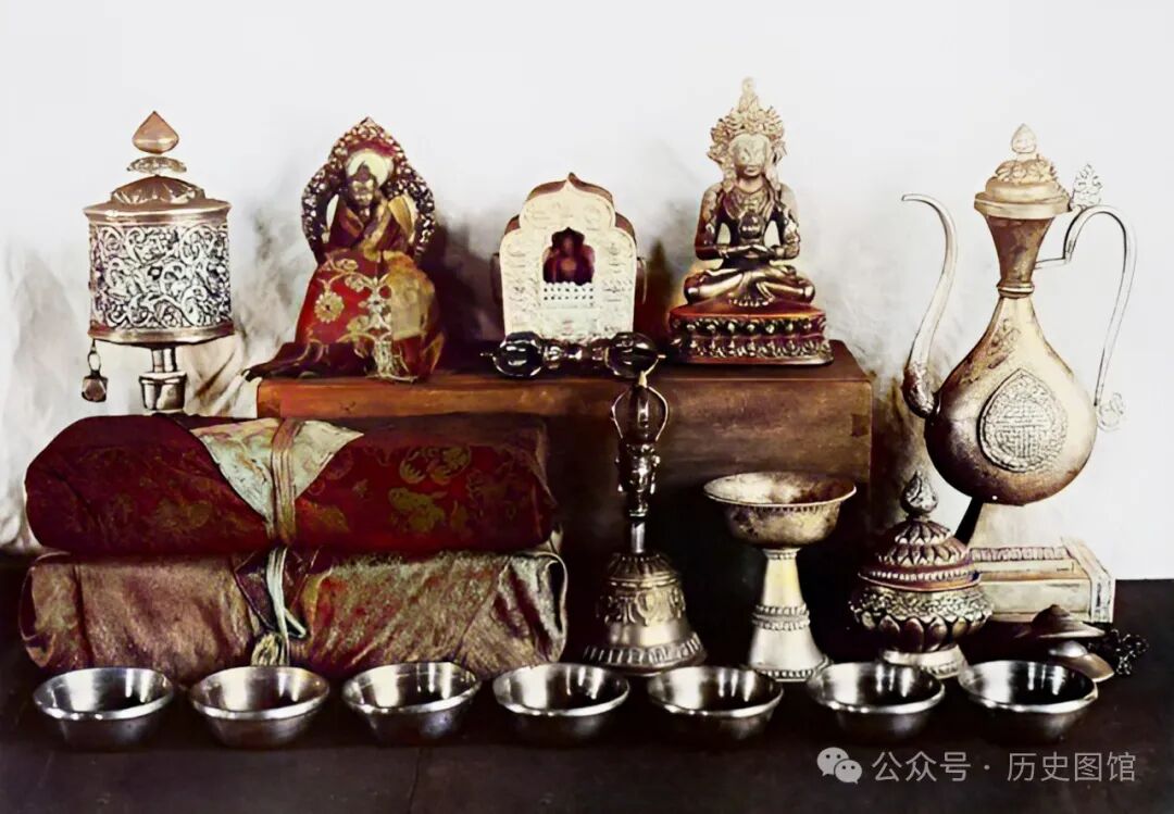 桌子上摆着的这些物件,是西藏喇嘛教徒使用的佛具和法器。有金器、银器等,制作都非常精美。这些佛具和法器,一般在祈请、修法、供养、法会等各类佛事时使用。照片拍摄于1927年。