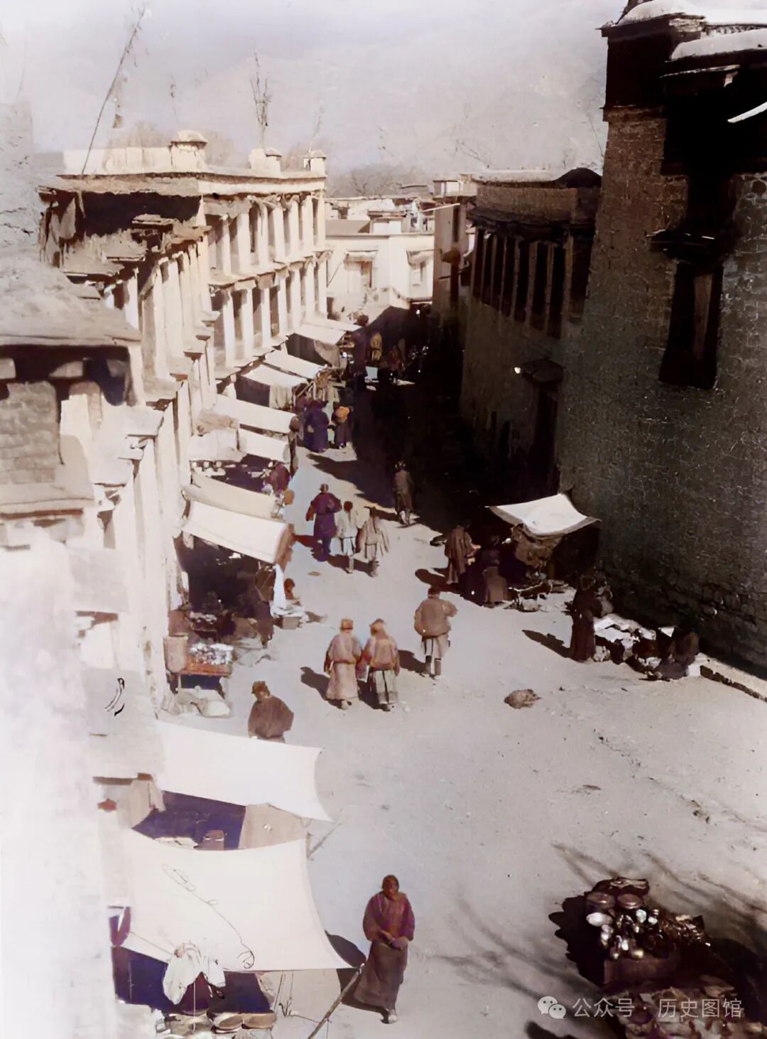 20年代,拉萨街道上的真实影像。当时拉萨的街道,看上去并不是很宽。两侧矗立的传统建筑古色古香。街道上人来人往,还有小贩在路边摆摊,画面富有市井生活气息。