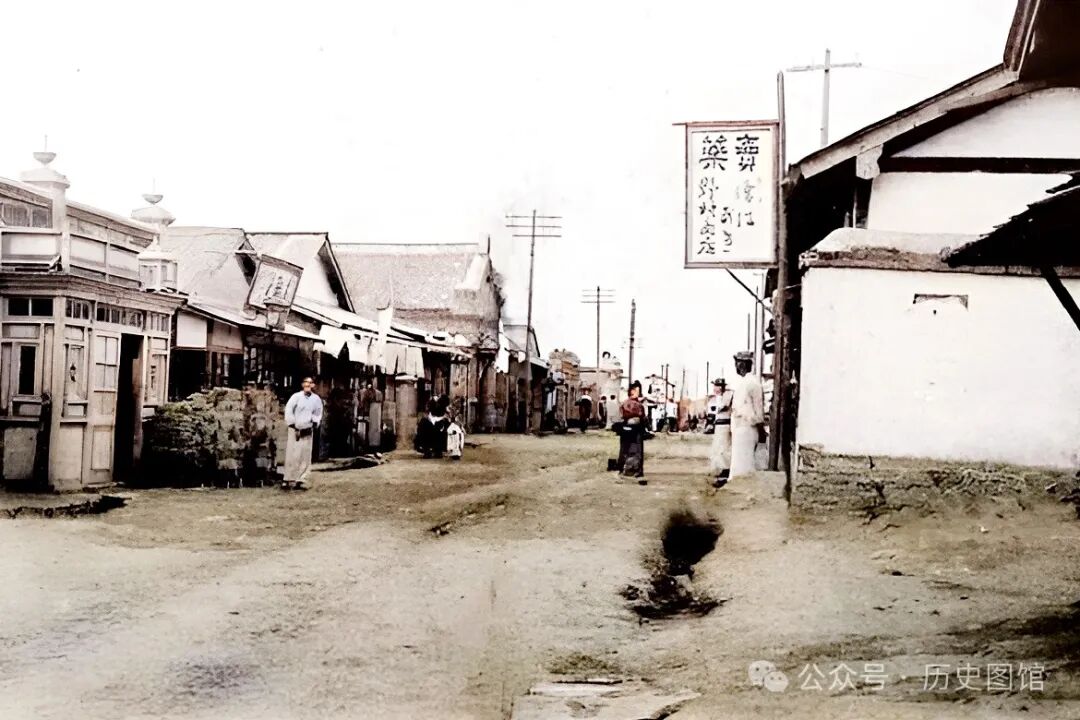 清朝末年,铁岭城内“元町通”街景。“这条街,就是西门外大街,即今天的繁荣路西段一带。照片中,街道不是很宽,路两旁是商铺。不时有日本女人从街上走过。