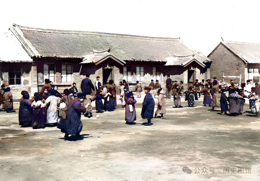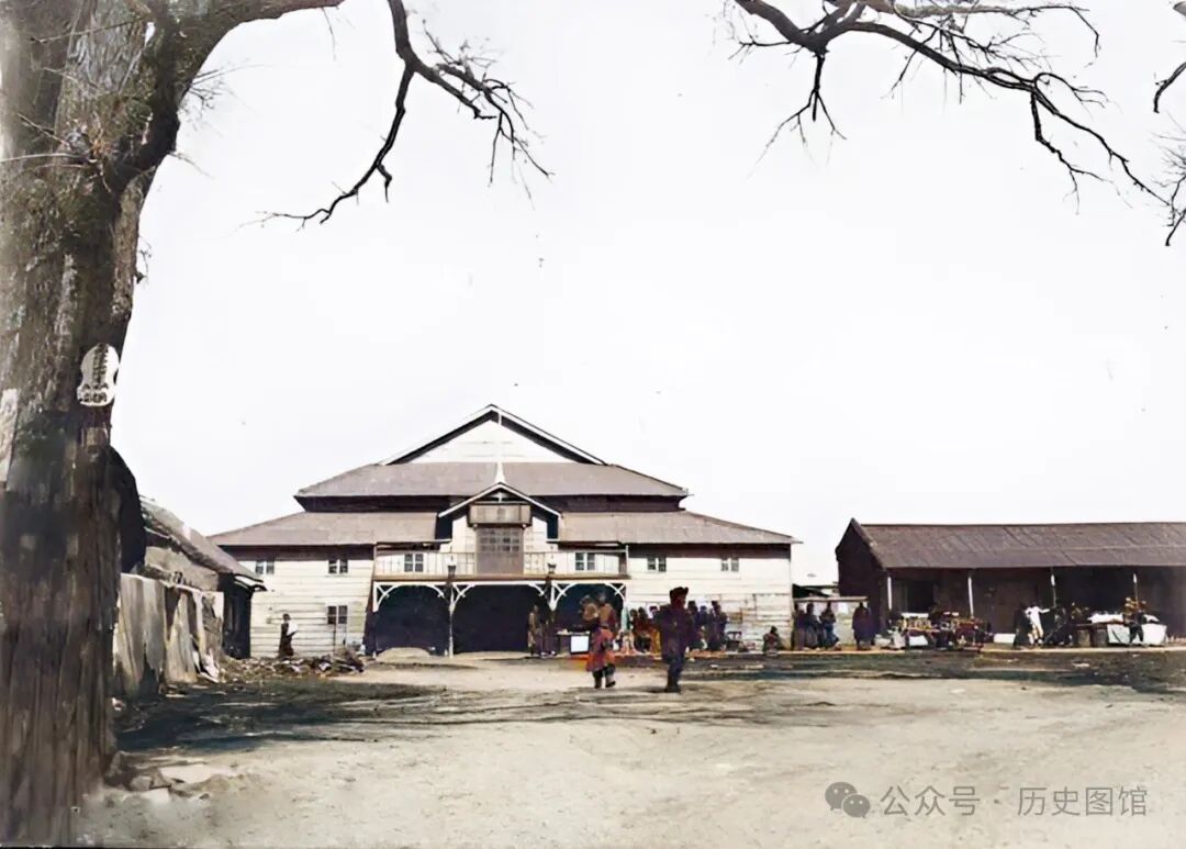 这座日式建筑,是清朝末年日本人在铁岭修建的一座剧场,名曰“芝居剧场”。芝居,在日语中是“戏剧”的意思。是一种通过图画展示和表演的讲故事形式。照片中,剧场前的广场上,有一些小贩在摆摊。