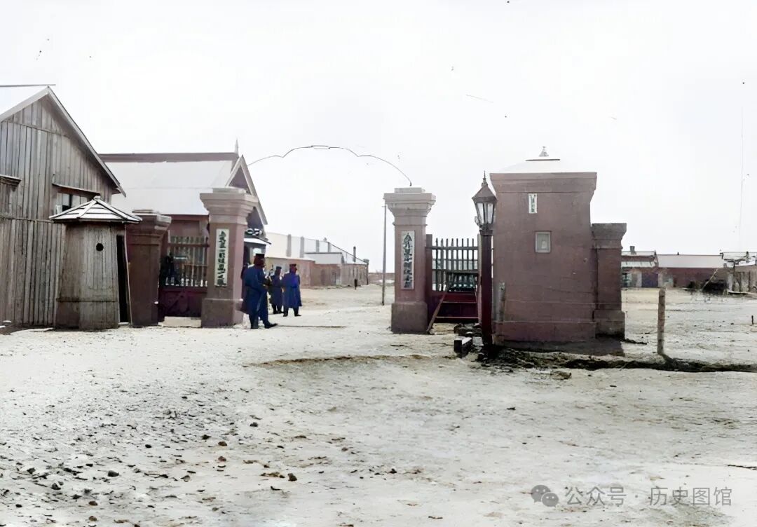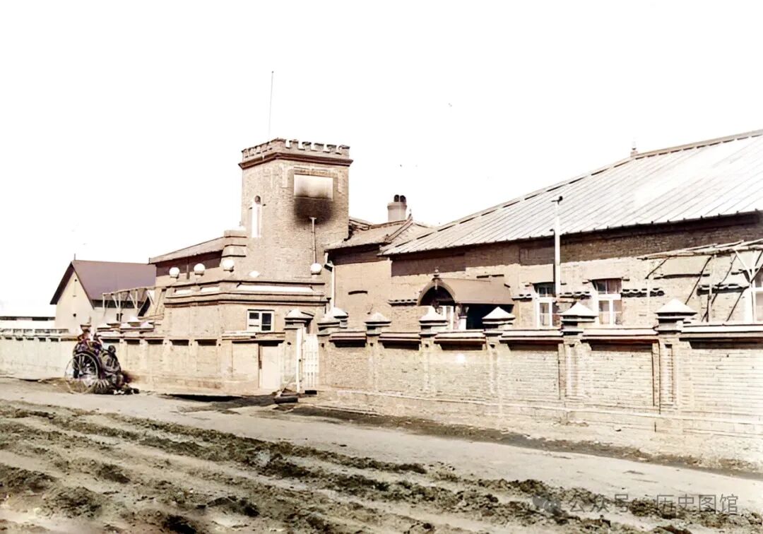 照片中这座大院,是日本关东军宪兵队驻地,里面驻扎的是日本步兵第10连队。门口设有岗亭、拉有铁丝网,有几名日军士兵把守。