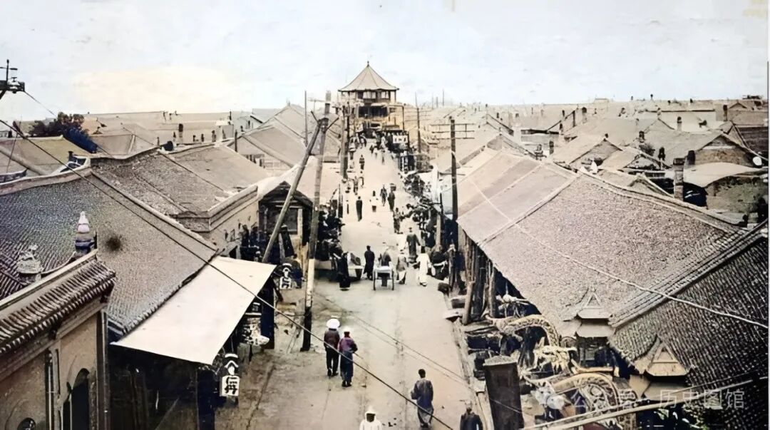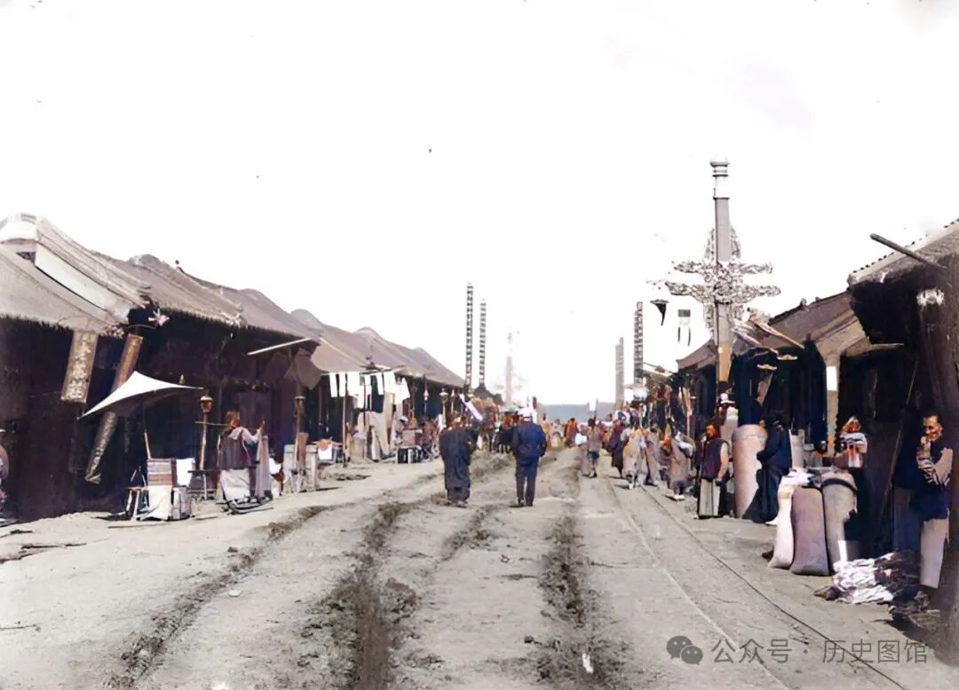 100多年前,铁岭东城门外街道上的景象。街道笔直,一眼望不到尽头。街道两侧传统建筑古色古香,沿街门店都在开门营业。门口的广告招牌琳琅满目,街上人来人往。