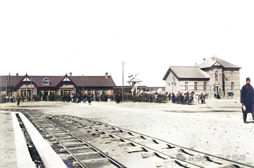 这张照片。拍摄于清朝末年的铁岭火车站。远处的站房前,停着很多人力黄包车,都在等待载客。两条窄轨铁道清晰可见。站前广场上,人来人往。