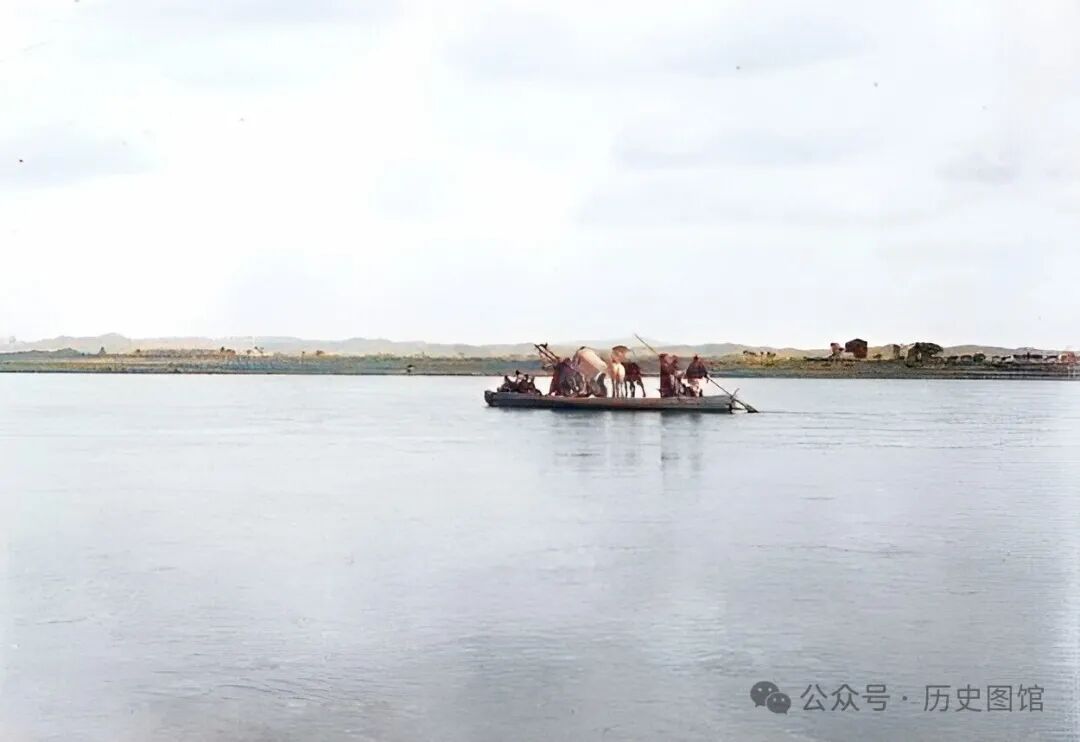这张照片,拍摄于当时的辽河之上。河面上,一艘小渡船正载着车马驶向对岸。