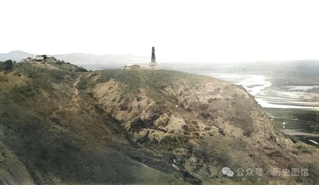 清朝末年,位于铁岭城东二里的龙首山公园风光,古老的慈清寺坐落在龙首山北峰之巅。慈清寺,原名秀峰寺、三清观,始建于唐代。照片中这座塔叫秀峰寺塔。远处的河流是柴河。