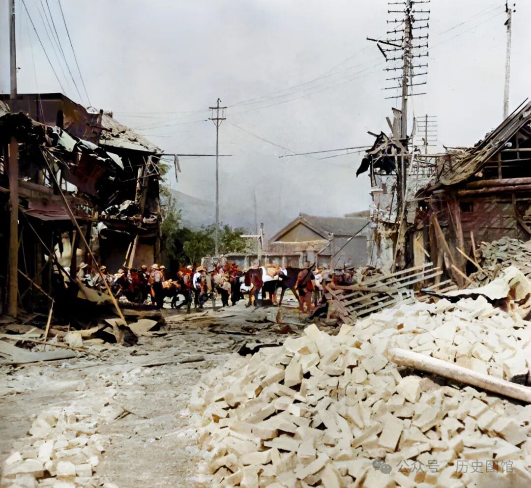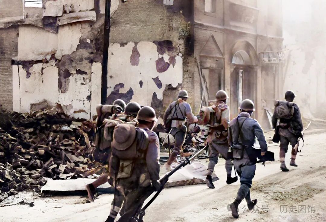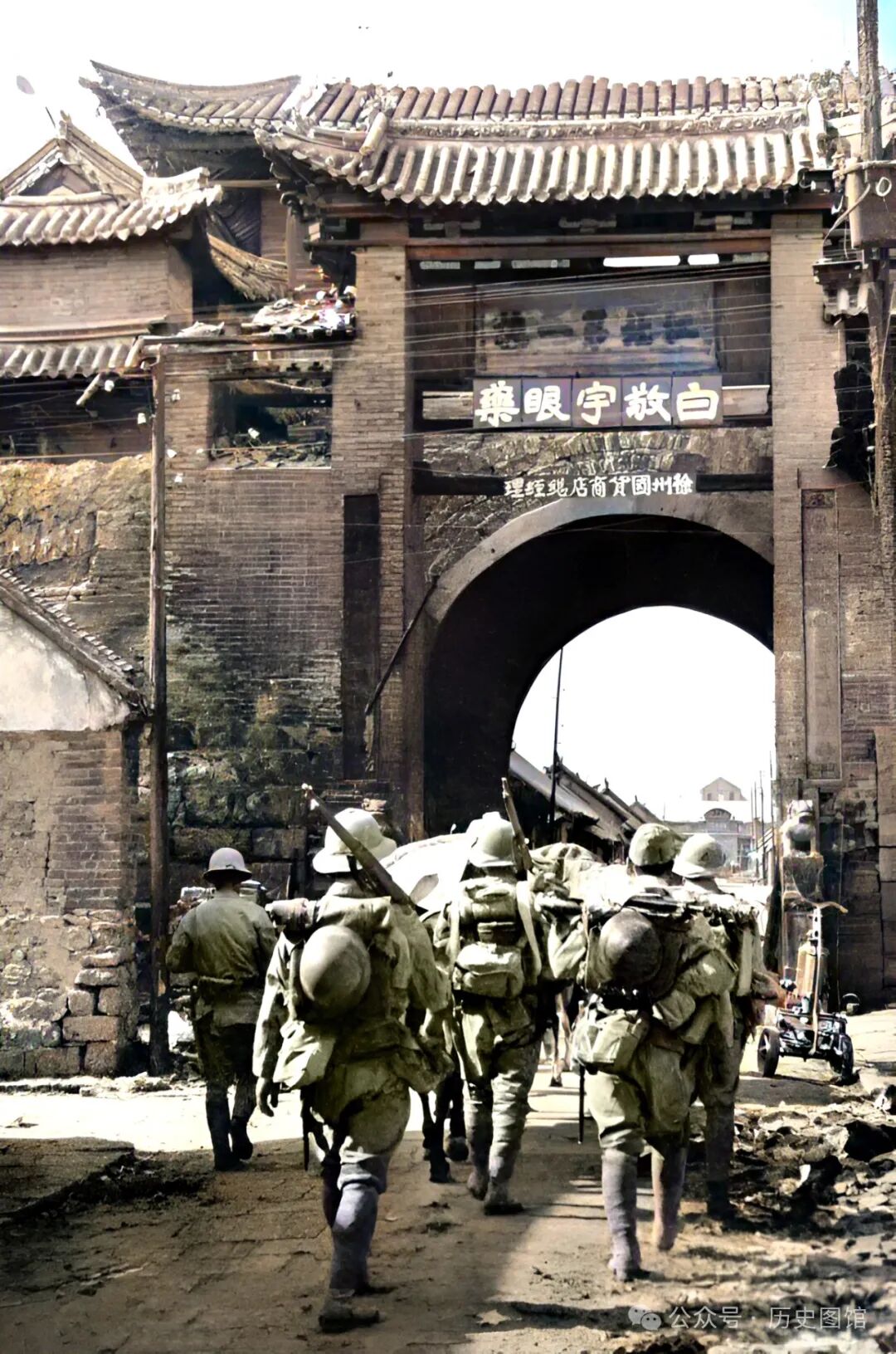 1938年5月19日,日军占领徐州后,两角部队的士兵荷枪实弹,正在火车站附近的街道上扫荡。到处是浓烟、残破的房屋和碎砖瓦砾。