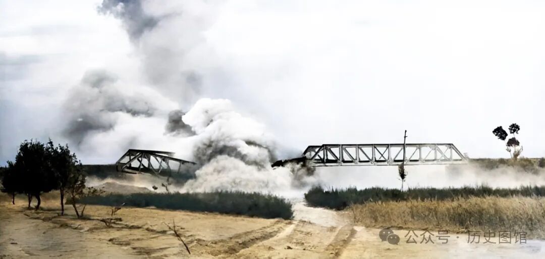 不仅如此,日军还将坦克隐藏在桥下,使得国军部队根本就来不及修理,陇海铁路之交通,已成瘫痪状态。日军摄影师拍下了铁桥被炸瞬间,浓烟滚滚。