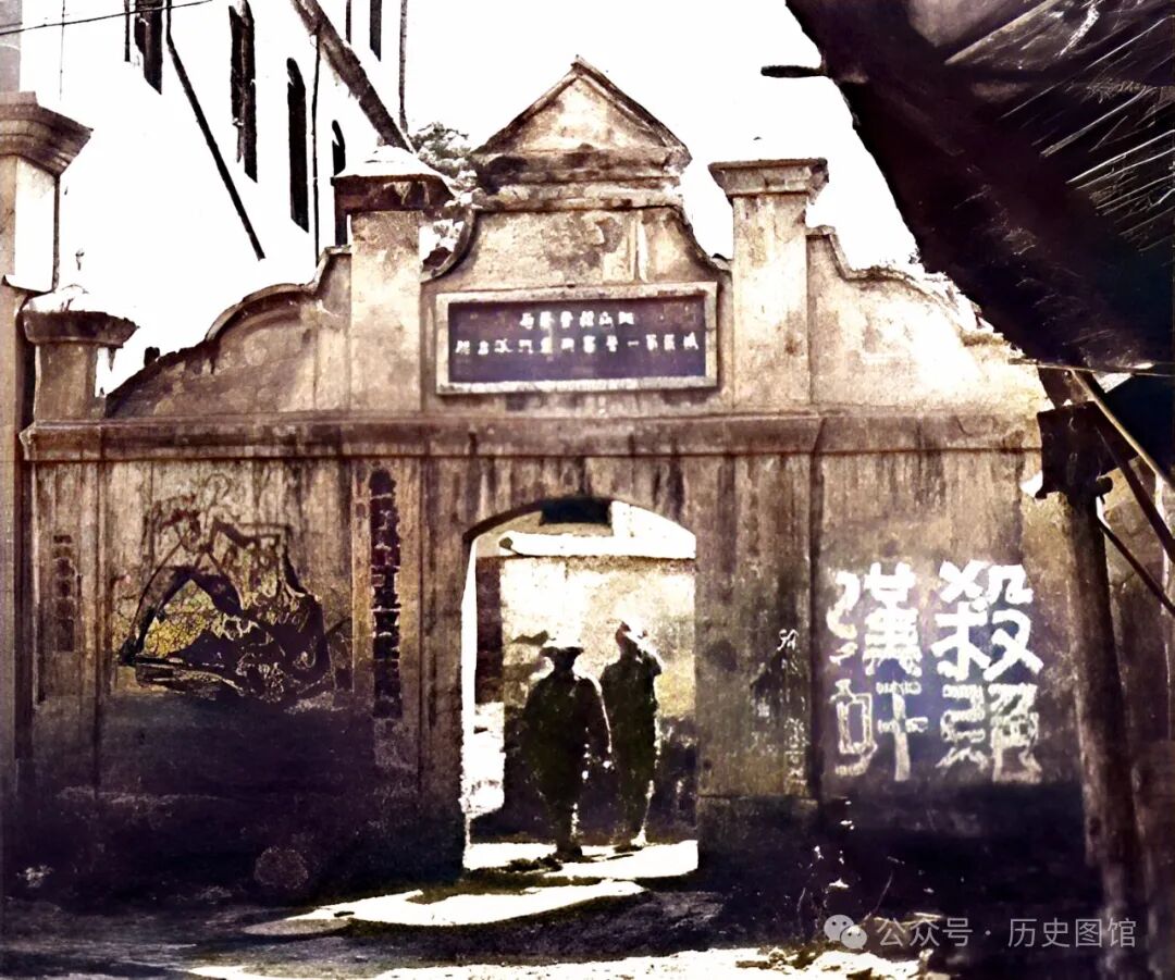 警察局大门两侧的墙壁上,书写着抗日标语和宣传画。四个白色大字,十分醒目。