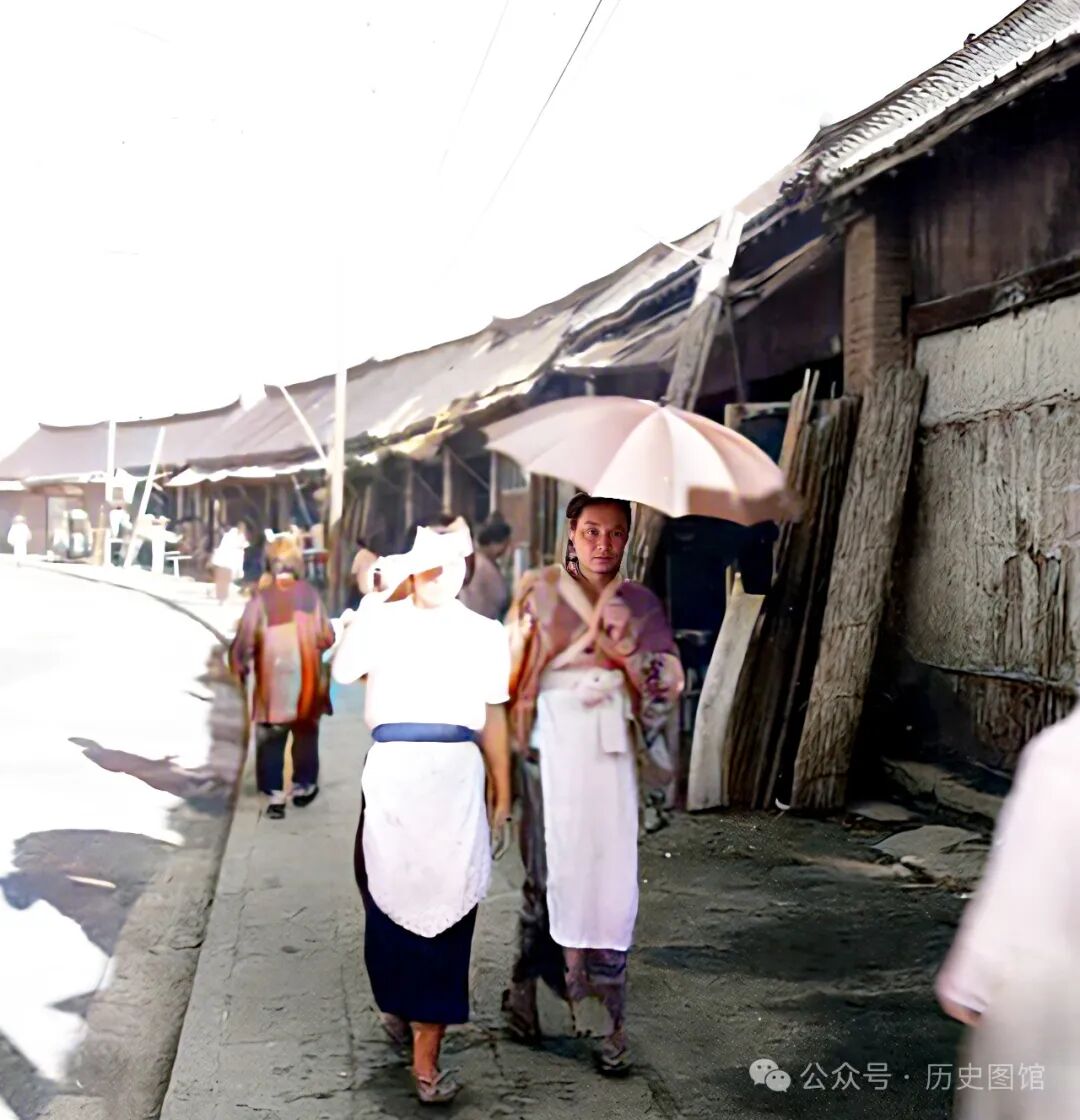 沦陷后的徐州街景,街边建筑古色古香,很有年代感。街道上没有什么人,冷冷清清的。两名日本女子打着伞从街头走过,她们脚上穿的木屐清晰可见。