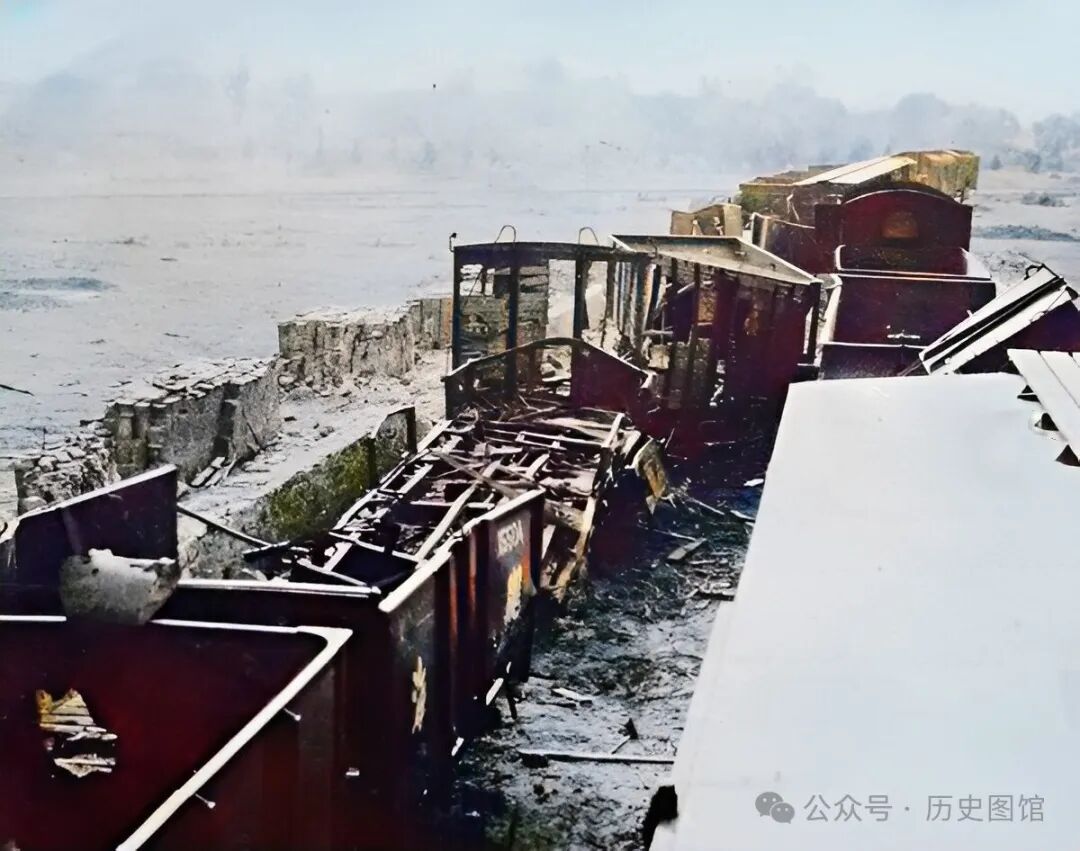 这是一列被日军飞机炸毁的火车,车厢被烧得只剩下了铁架,看上去触目惊心。车站外面的建筑,也被夷为平地。当地百姓将收集的砖瓦堆放在路边。