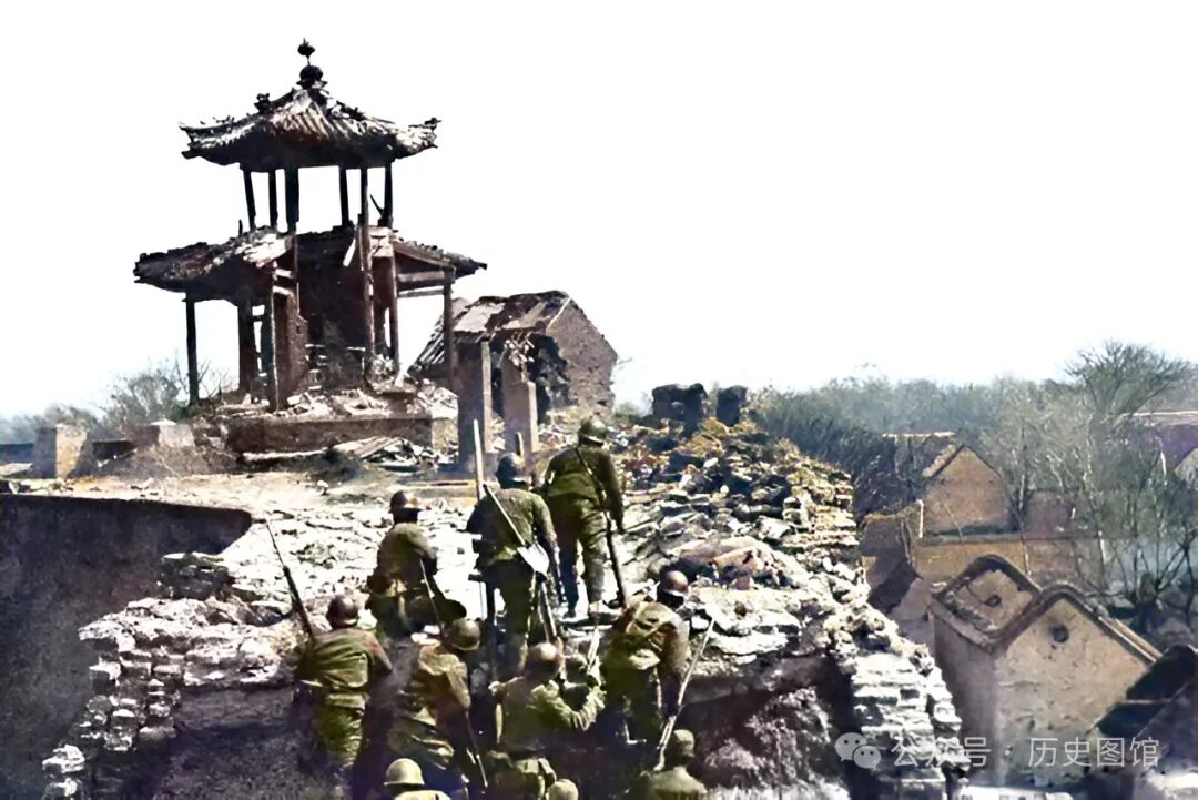 在这张照片里,日军为了攻城,使用大炮和炸药,将坚固的城墙炸开一个缺口,一股日军乘机涌上了城头。城墙内侧,百姓的房屋也受到了波及,屋顶被炸坍塌。