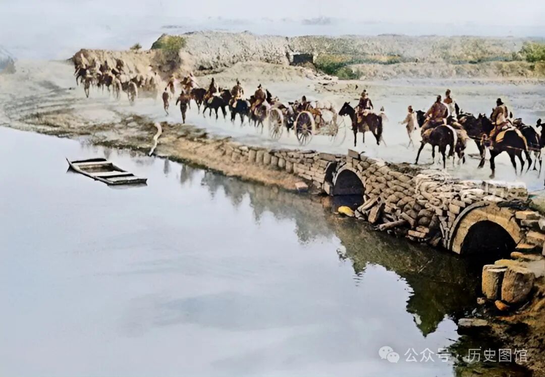 日军向徐州进犯途中,一支辎重部队正在通过河上的一座小桥,车辆和马匹浩浩荡荡驶过桥面。河里一艘小船也被凿沉,远处的寨墙也被日军炸塌。日军辎重部队,一般是运武器装备的。