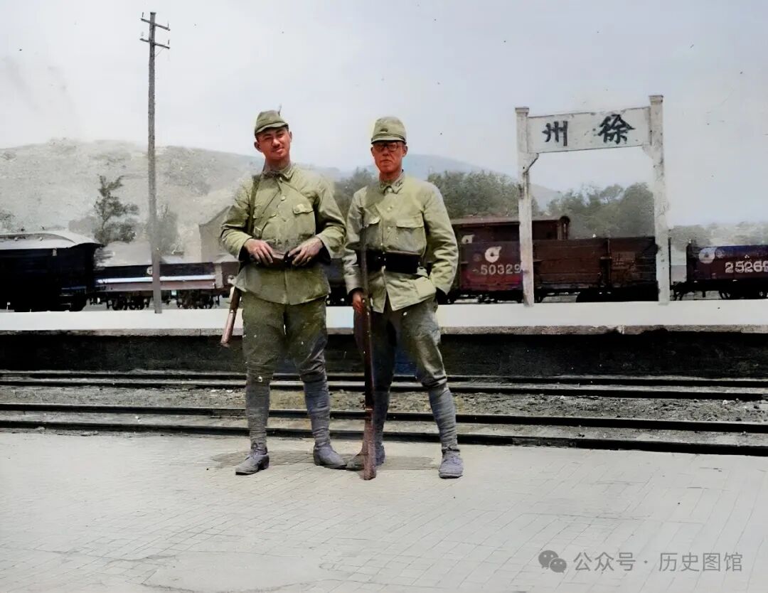 日军占领徐州后,两名士兵站在铁道边上,摆出一副胜利者的姿态拍照,两人的表情和动作着实令人憎恶。