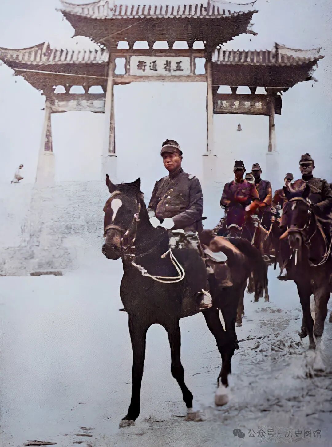1938年,日军占领徐州。几名日本军官骑着马在城里耀武扬威。他们身后这座高大的牌坊,也是徐州的标志性建筑,牌坊题额上书“五省通衢”四个大字。