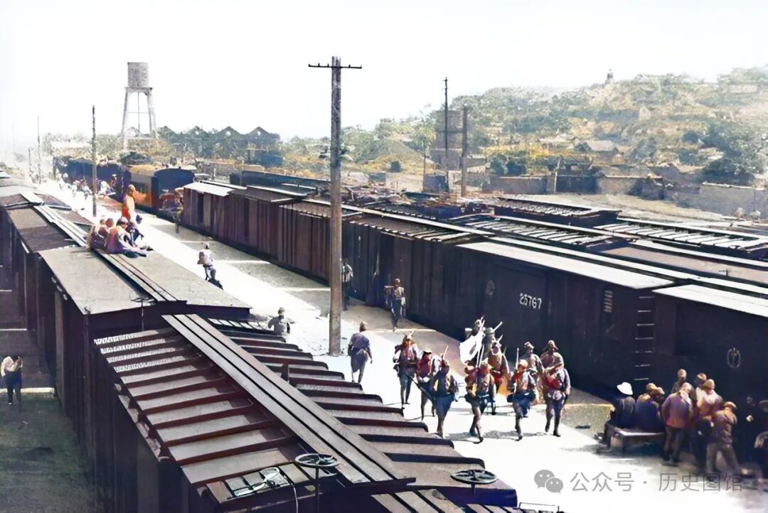 1938年5月22日,徐州火车站上,一股日军在站台上巡逻。日军占领徐州时,徐州火车站工作人员,将火车向津浦、陇海两线南撤。在这期间,他们还帮助抗战军队输送军事物资,运送难民,为抗战做出了一定贡献。