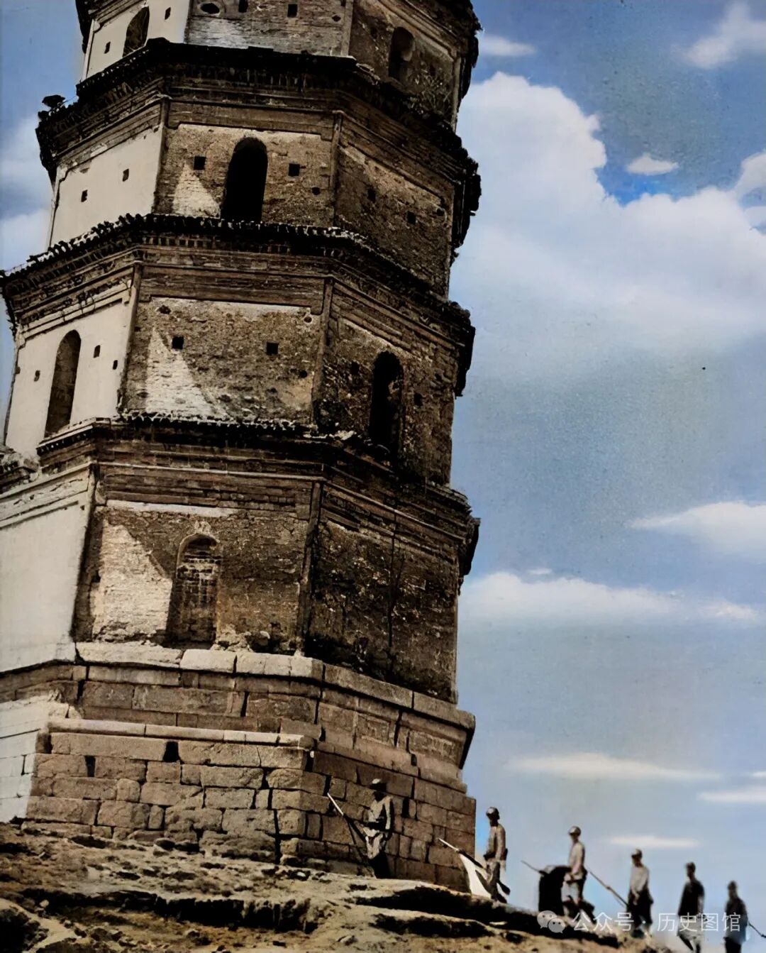 1938年,日军一支巡逻队,从奎山塔下经过。高大挺拔的塔身,看上去十分古朴壮观。