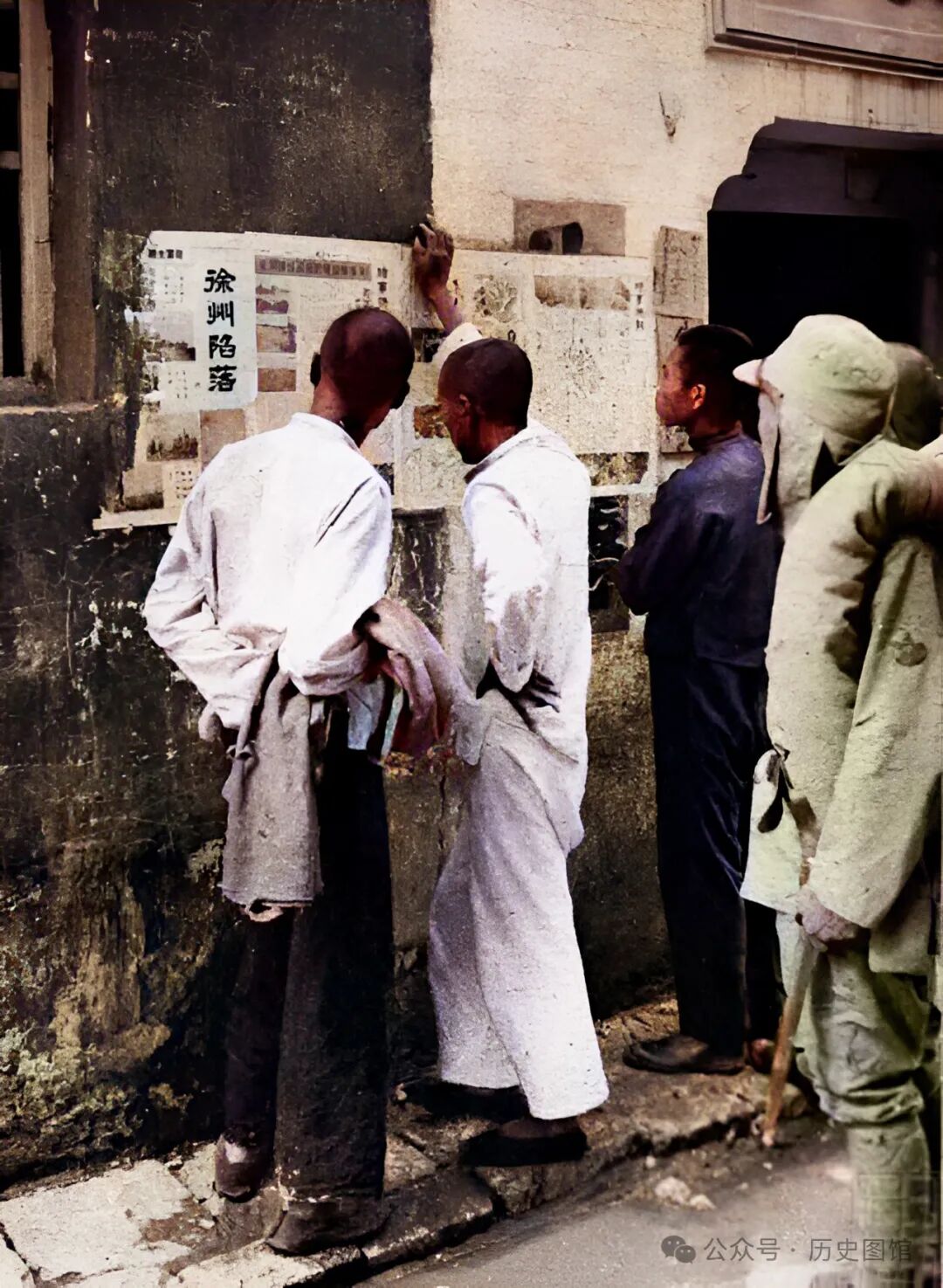1938年,徐州沦陷后,街边建筑物的墙壁上,贴着几份报纸。当地百姓在街头读报,报纸上的大标题赫然写着“徐州沦陷”字样。面对时局,每个人都面色凝重。两名日军士兵也站在人群后面观看。
