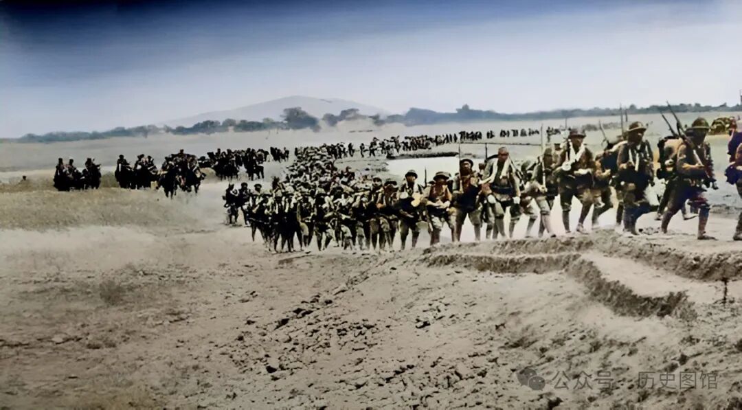 这张照片,拍摄于蒙城郊外。日军一支大部队,正浩浩荡荡向徐州进犯,队伍一眼望不到尽头。1938年8月8日,日军攻打蒙城,8月9日蒙城陷落。