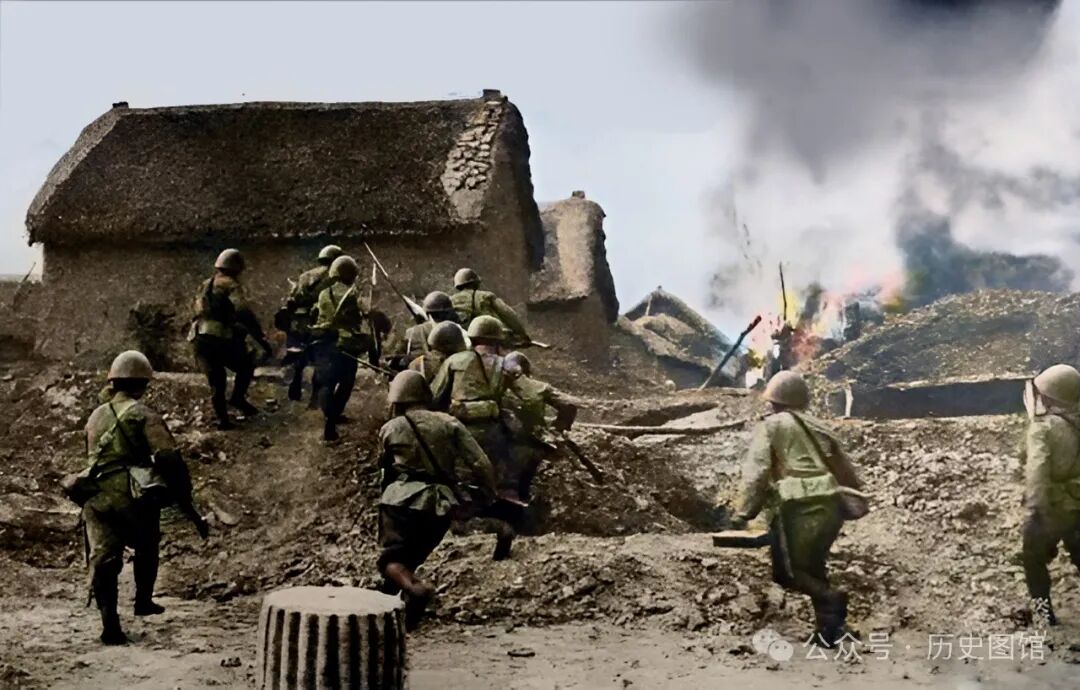 十几名日军端着枪,在炮火的掩护下冲向村子里。驻守在村子里的中国军人奋起抵抗,打退日军多次进攻。
