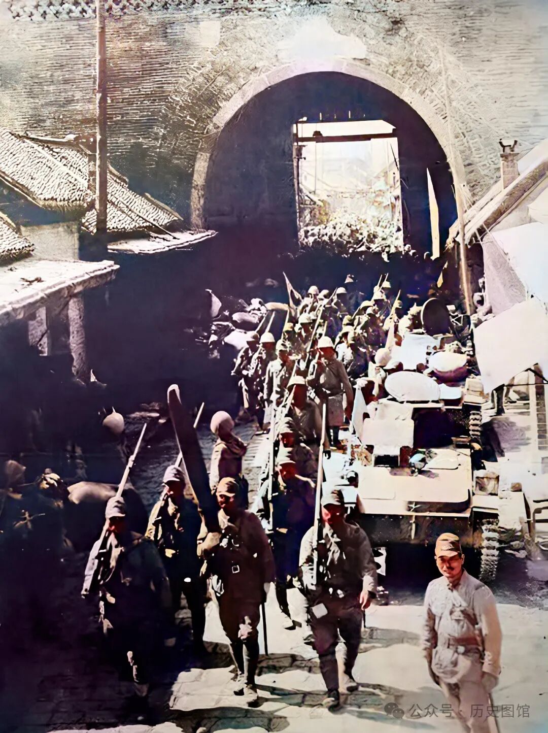 1938年,日军占领徐州后,举行了规模宏大的入城仪式。照片中,日军的步兵、装甲车、坦克,浩浩荡荡正在从鼓楼下通过。照片上的鼓楼高大雄伟。这是鼓楼北面。